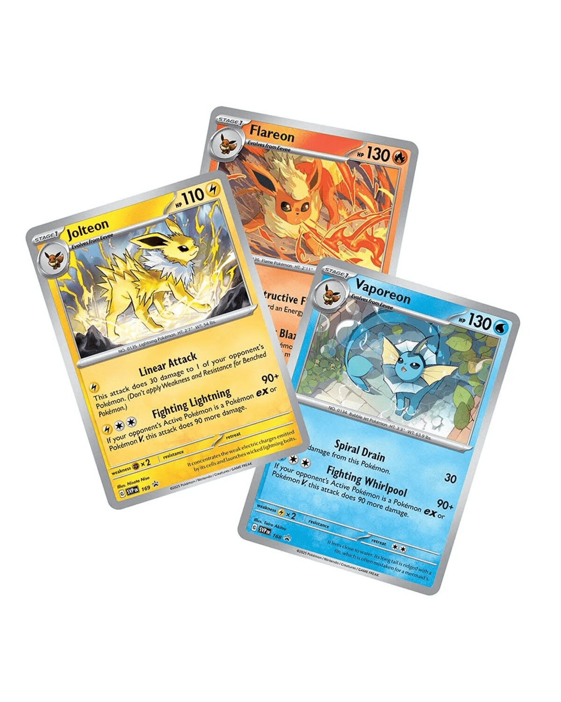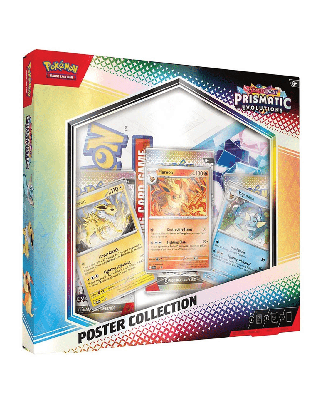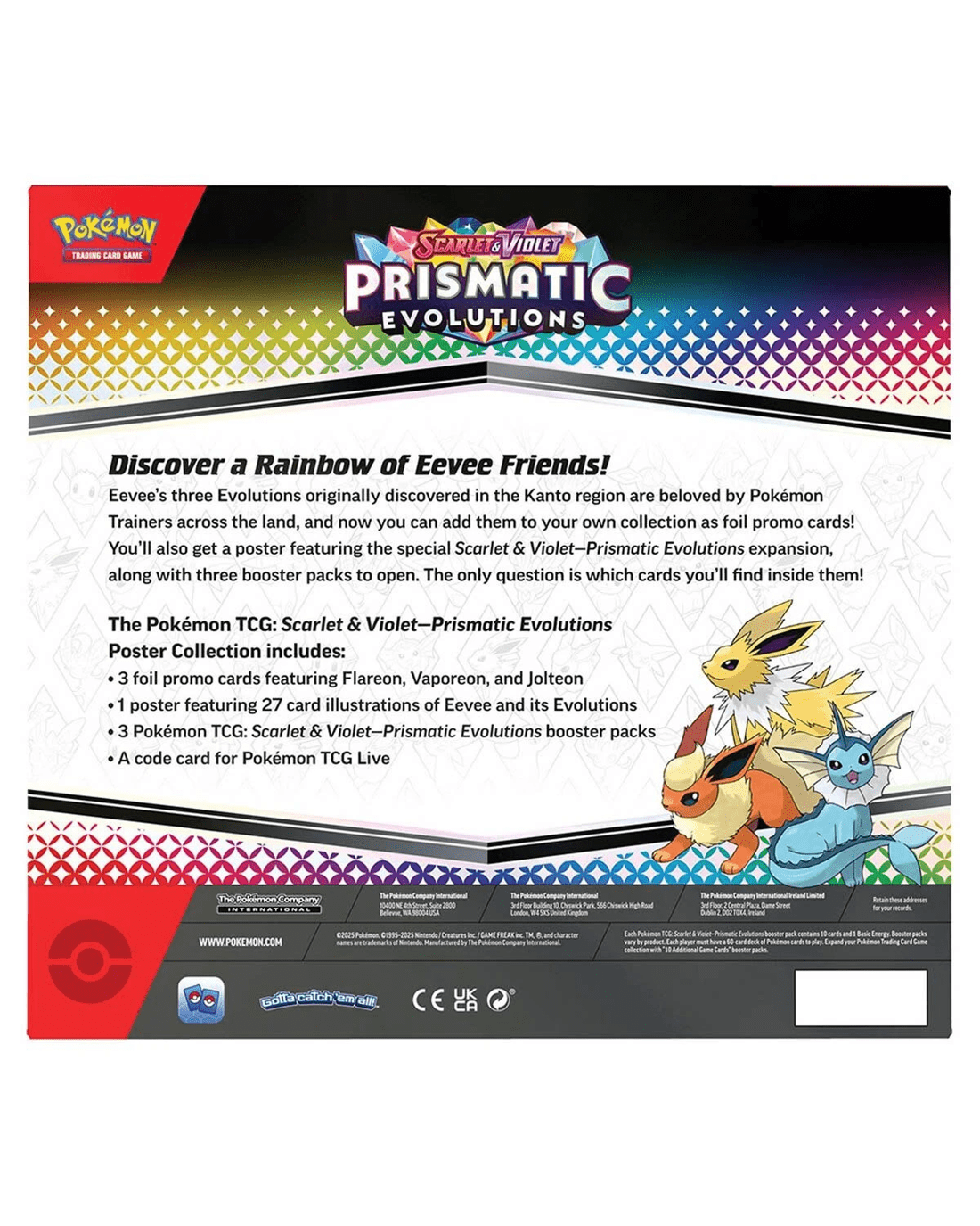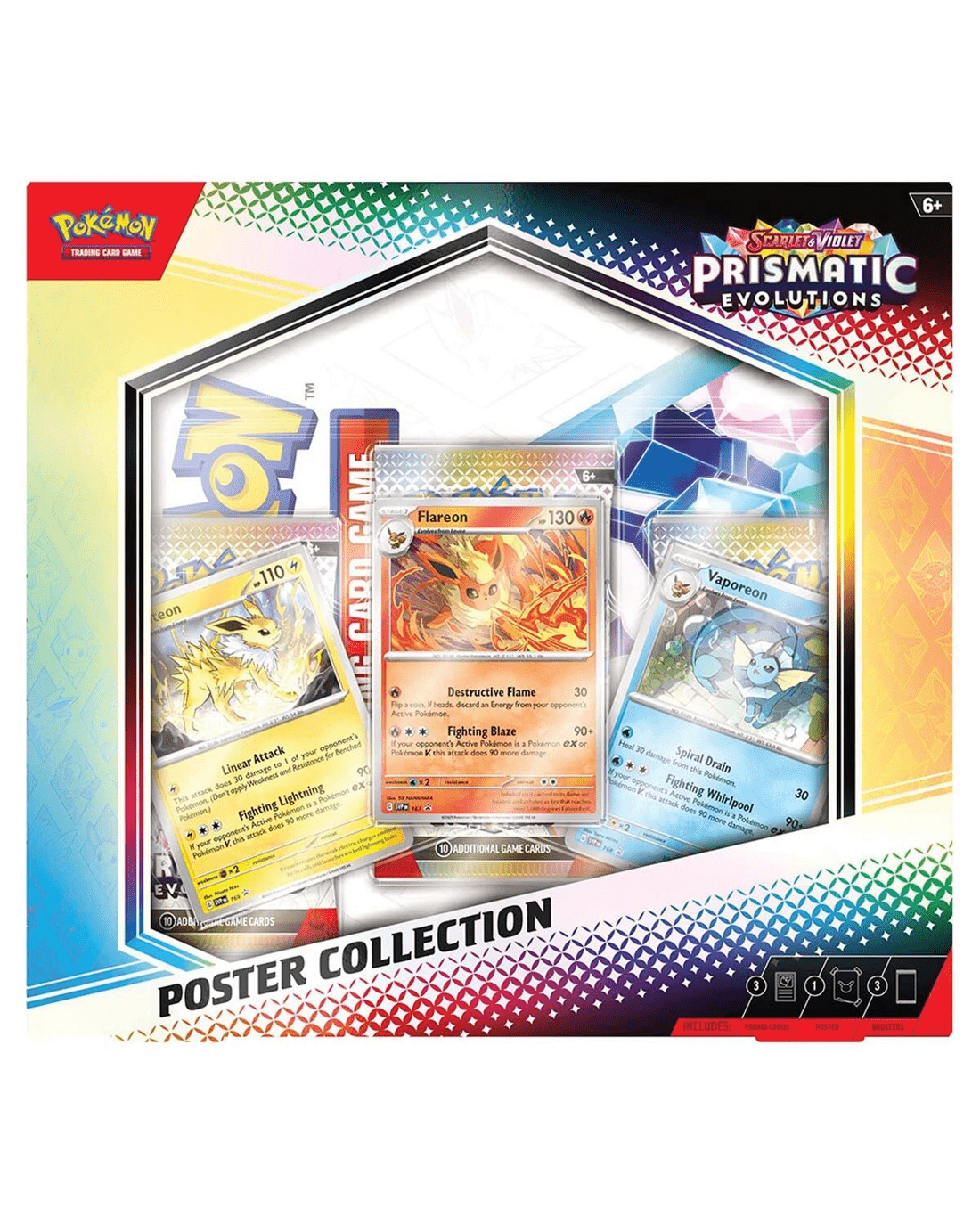 - Includes 3 x foil promo cards featuring Flareon, Vaporeon and Jolteon, 1 x poster featuring 27 card illustrations of Eevee and its Evolutions, 3 x Pokemon TCG: Scarlet & Violet - Prismatic Evolutions booster packs and 1 x code card for Pokemon TCG Live