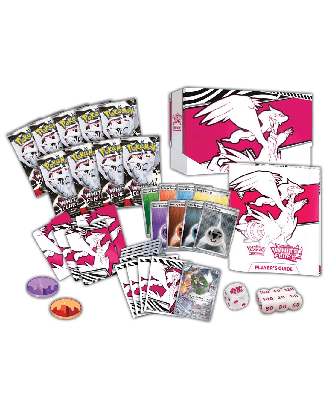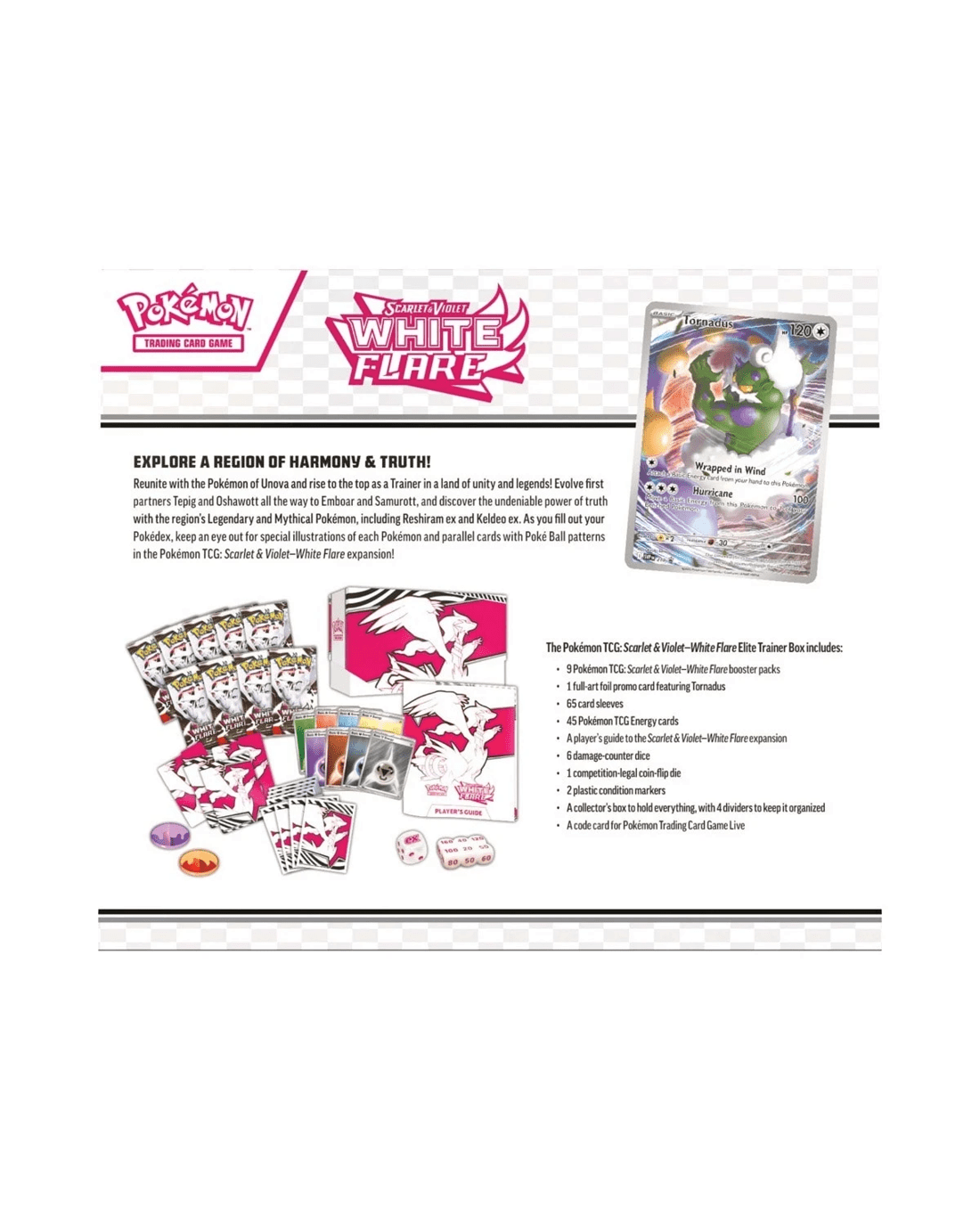- Includes 9 x Pokemon TCG: Scarlet & Violet- White Flare booster packs, 1 x full-art foil promo card featuring Tornadus, 65 x card sleeves, 45 x Pokemon TCG Energy cards, 1 x player's guide to the Scarlet & Violet - White Flare expansion, 6 x damage-counter dice, 1 x competition-legal coin-flip die, 2 x plastic condition markers, 1 x collector’s box to hold everything, with 4 dividers to keep it organised and 1 x code card for Pokemon Trading Card Game Live