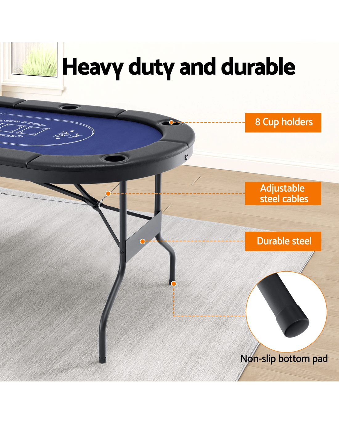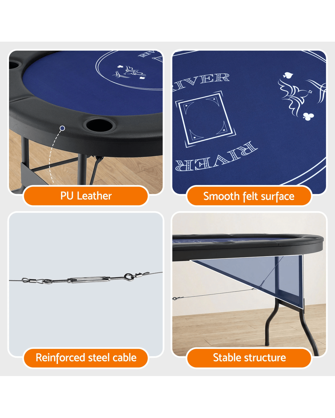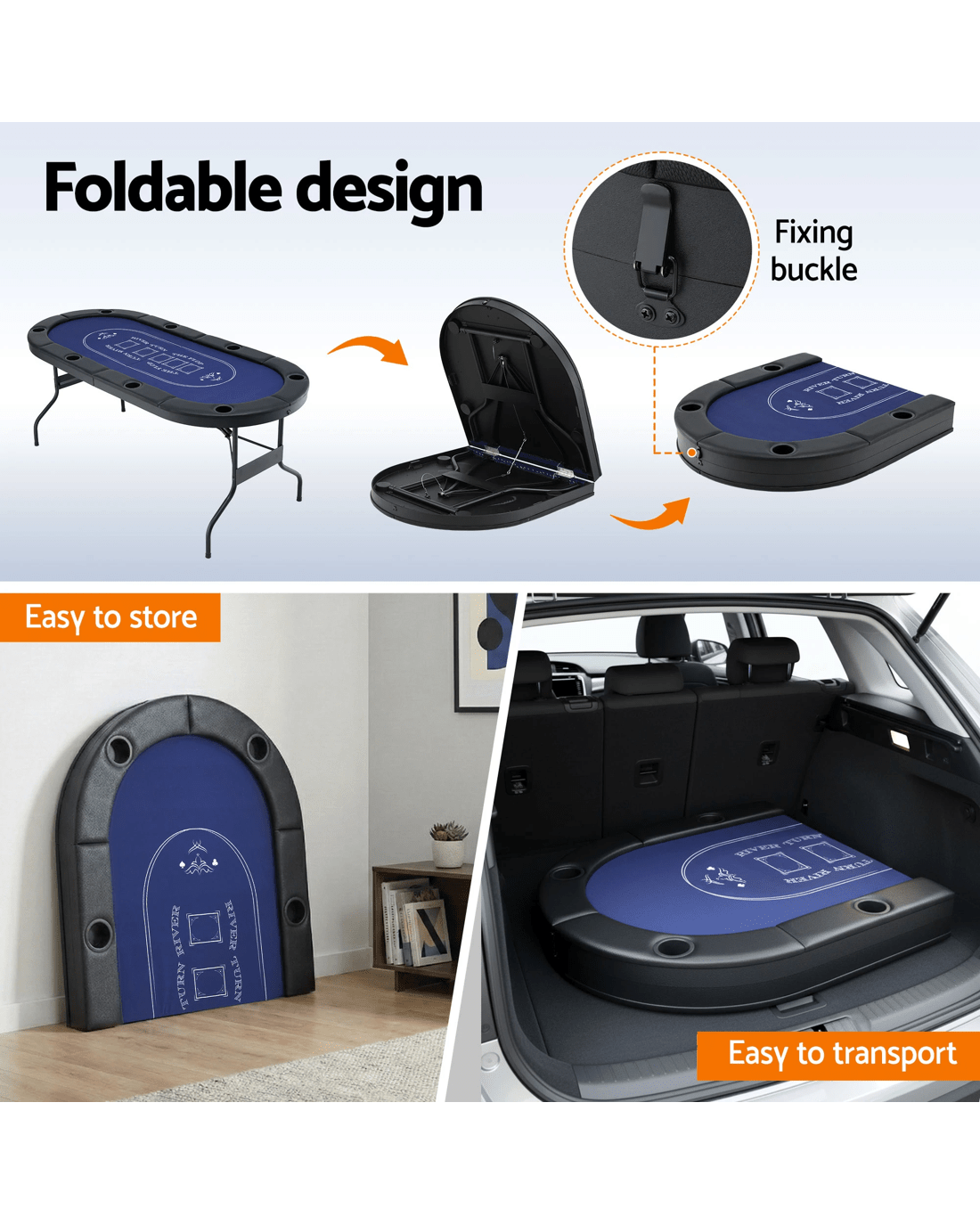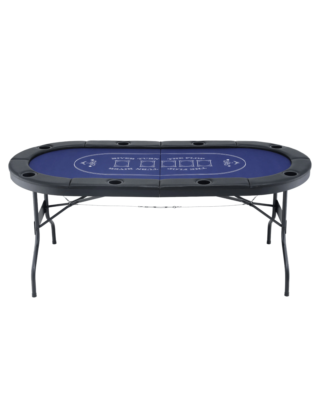 Host your next card night with this 183cm folding poker table. This poker table top is ideal for 6 to 8 players. The smooth, casino-style felt surface and PU leather rails are ready for any game. It features a folding poker table with cup holders (8 in total) and a sturdy metal frame. When you're done, this poker table folds in seconds for easy storage. No tools needed.