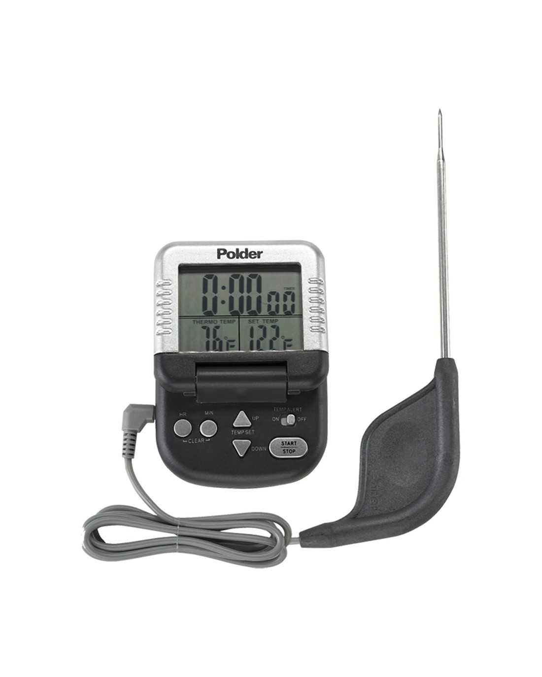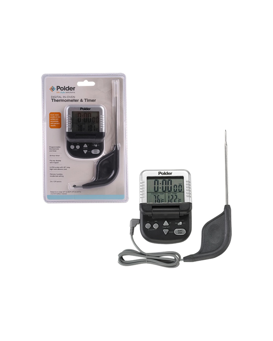 The Polder Programmable Digital In Oven Thermometer & Timer is designed for accurately monitoring the temperature of your meat during cooking. It offers reliable safety features and precise control, making it an essential tool for both casual and serious cooks.This thermometer provides a range of useful features including a programmable timer up to 24 hours, a split screen digital display for easy viewing, a memory function that recalls the last set temperature, and optional alerts when your desired temperature is reached. Its flexible silicone cord and extra-thin probe allow for easy insertion with smaller punctures, ensuring versatile and safe use in your kitchen.Key Features:Precise Temperature Monitoring: Delivers accurate readings for perfect cooking results and food safety.Customisable Cooking Control: Programmable up to 24 hours with memory recall for convenience and precision.Ease of Use: Features a flip-top display and magnet for easy access and placement during cooking.Flexible and Durable Design: Includes a high heat silicone cord and an extra-thin probe for versatile use.Enhanced Safety and Versatility: Optional alerts and temperature measurement from 0C to 200C (also measures in Fahrenheit).Specifications:Brand: POLDERProduct Type: Kitchen tools and gadgetsForm: Digital thermometer with probeTemperature Range: 0C to 200C, also in FahrenheitDisplay: Split-screen digitalFeatures: Programmable timer (up to 24 hours), memory function, alert switch, flip-top display, magnetProbe: Extra-thin tip connected by a flexible high heat silicone cordPower: 1 x AAA battery includedWipe clean after use for maintenance. Suitable for monitoring meat temperature accurately while cooking. Designed with user convenience and safety in mind, it is a reliable kitchen companion for all cooking levels.