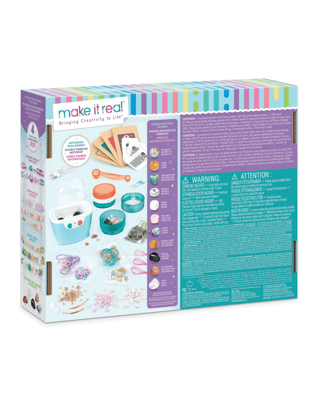 - Includes 332 pcs, 1 x mini beads tumbler, 1 x tumbling barrel, 2 x tumbling covers, 2 x 15g of tumbling medium, 1 x detachable usb cable, 57 x natural stone beads including (agalmatolite, aventurine, citrine, magnesite, marble, quartz), 60 x glass beads, 181 x plated accent beads, 8 x signature friction beads, 8 x cords, 1 x measuring spoon, 2 x strainers, 1 x bag of coarse grinding grit, 1 x bag of pre-polishing grit, 1 x bag of polishing grit, 50g of variety of rocks (adventurine, agate, crystal, fluorite, obsidian, yolk), 3 x cleaning brushes, 1 x instruction sheet