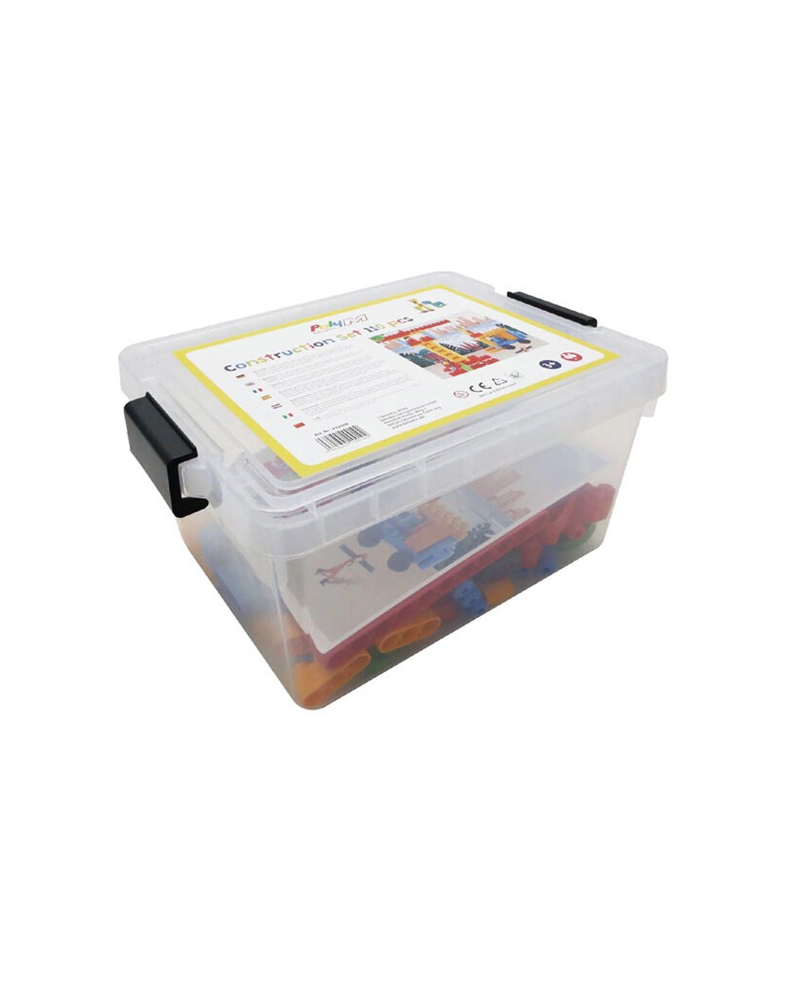 - Includes: 104 blocks, 4 sets of wheels, 2 figurines, storage container