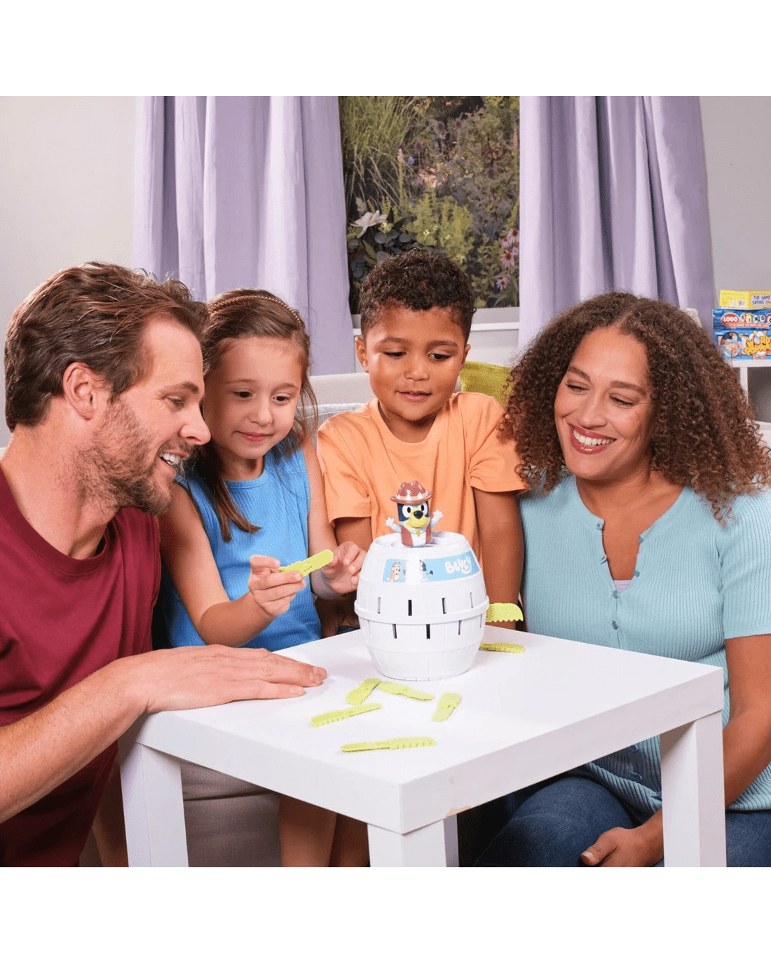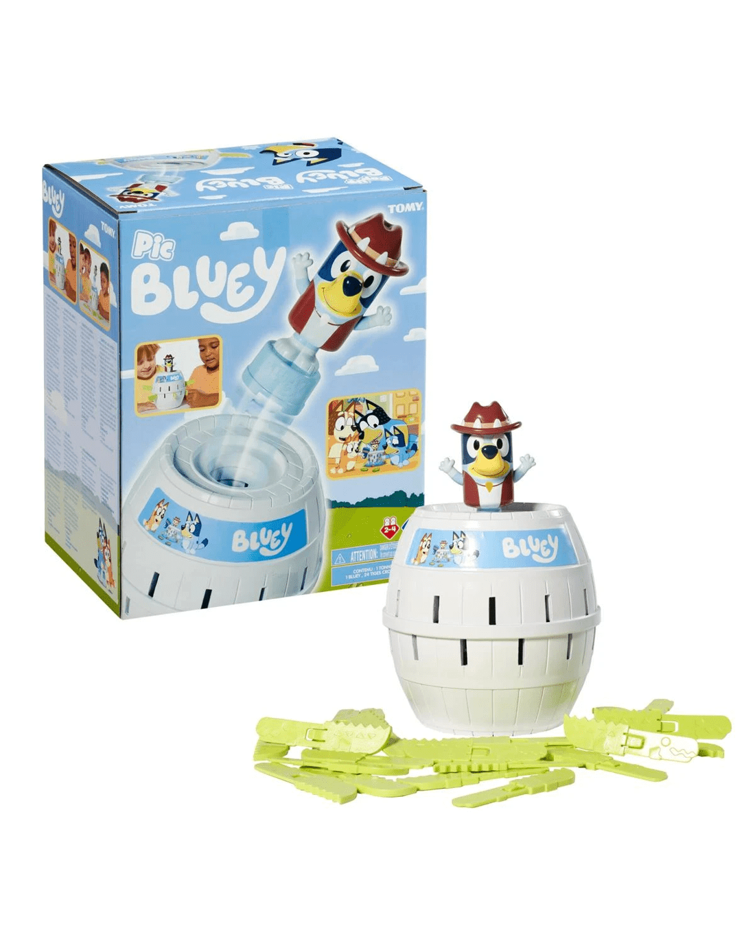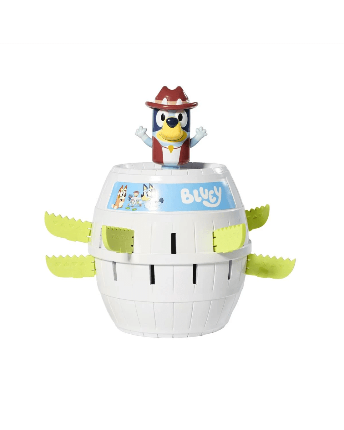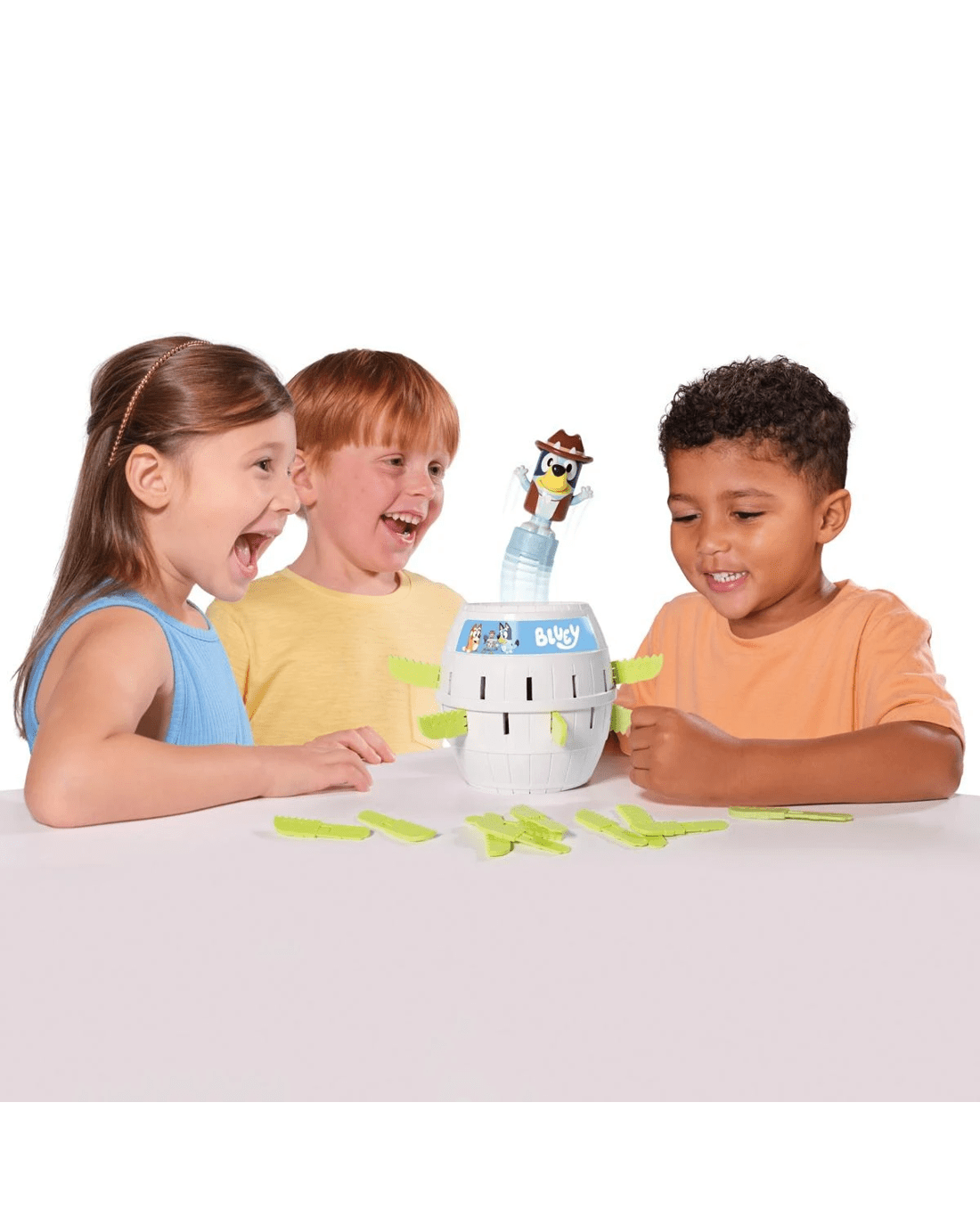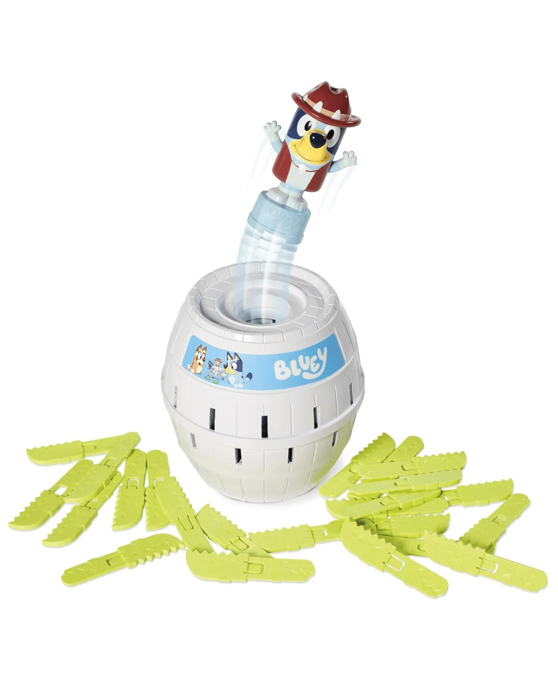 - Kids' action game: Take turns sliding the crocodile sticks into Bluey's barrel but pick the wrong slot and…POP! Bluey is out of her barrel and so are you!