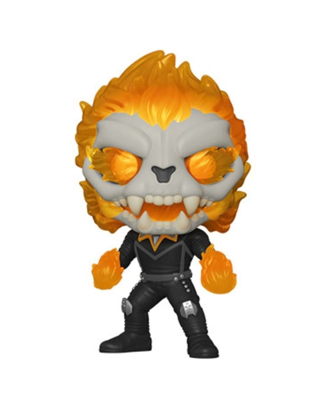 With a height of approximately 10cm, this compact figure is ideal for display in any collection. Crafted from durable plastic/vinyl, it ensures long-lasting quality. Its detailed design features a striking lion skull face with fiery accents and a sleek black outfit with orange highlights, making it a standout piece for display purposes.
