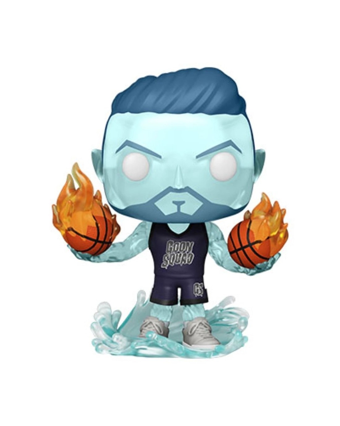 Made of durable plastic/vinyl, this figure features a dynamic pose with fiery basketballs in each hand, standing on a water-like base which enhances its visual appeal. Its detailed design includes sports attire with the words Good Squad and exaggerated cartoon proportions, making it a striking display piece suitable for any collection.