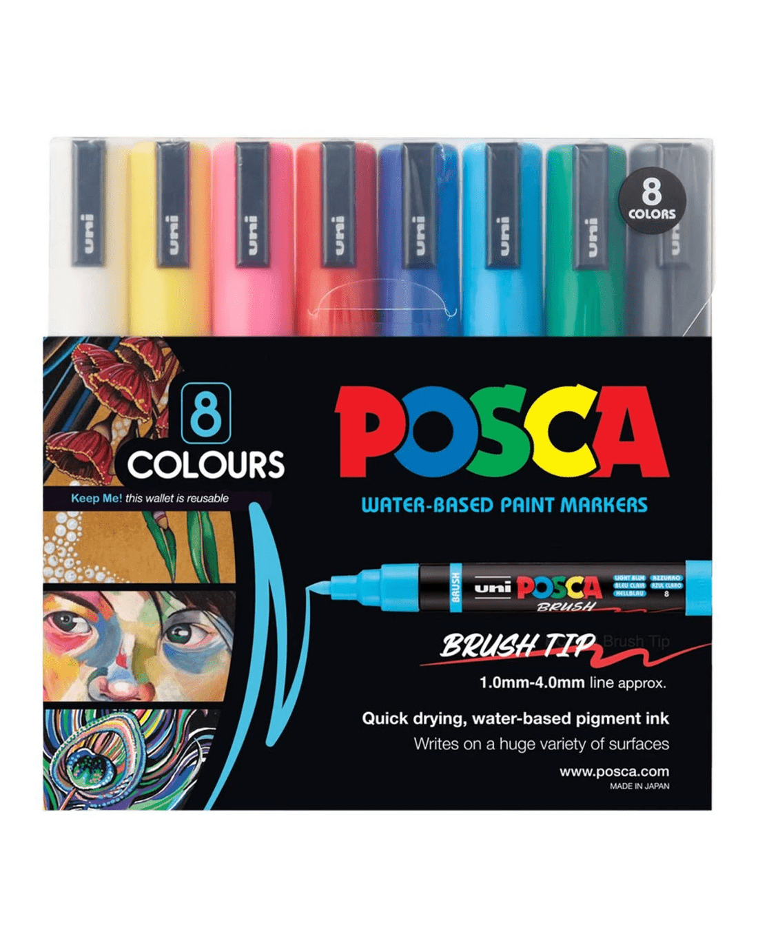 - Please refer to the “Posca Markers Product Information Brochure” (attached below) for further information on the various Posca nib sizes, colour options across each nib size, information on the various surfaces Poscas will work on, as well as some inspiration for your work.