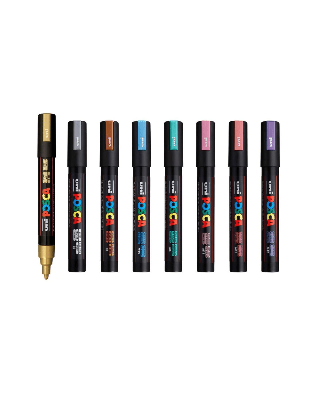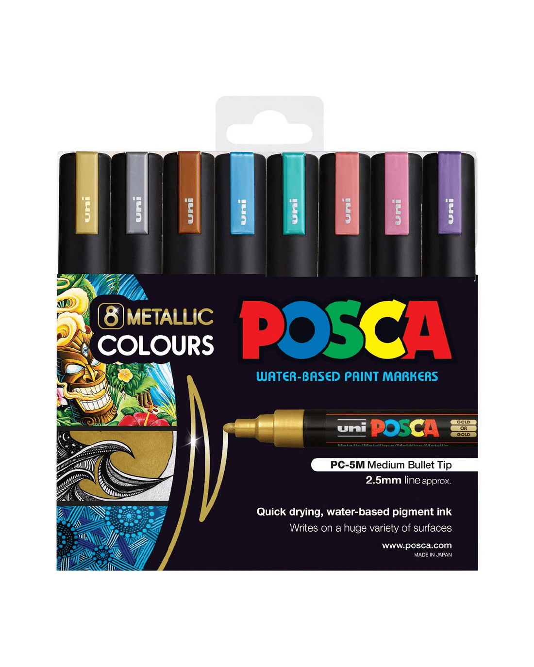 If you're looking for the ultimate, versatile creative tool designed for professional and amatuer artists alike, try out Uni's POSCA PC 5M Paint Markers. Decorate paper, metal, glass, wood, plastic and more with these quick-dry, water-based markers. This pack comes with 8 vibrant, metallic coloured markers fit with 1.8–2.5mm tips for you to expand your artistic expression.