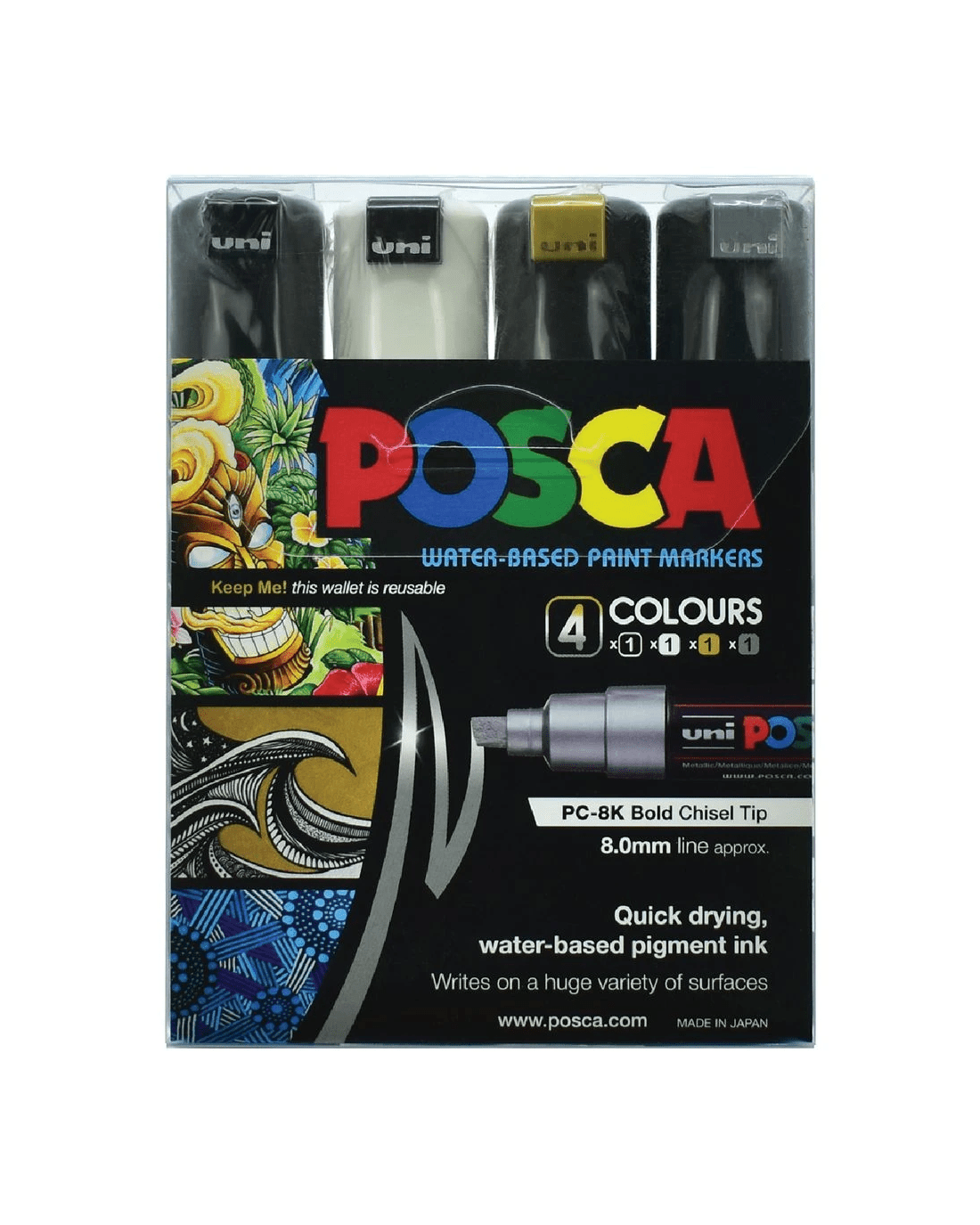 POSCA PC-8K Poster Markers have water-based pigments which can be blended when wet or overlaid when dry. Each marker has a chisel tip to produce thin lines on the point and thick, 8.0 mm lines on the side. Plus, they can be used on a variety of surfaces making it a versatile writing utensil.