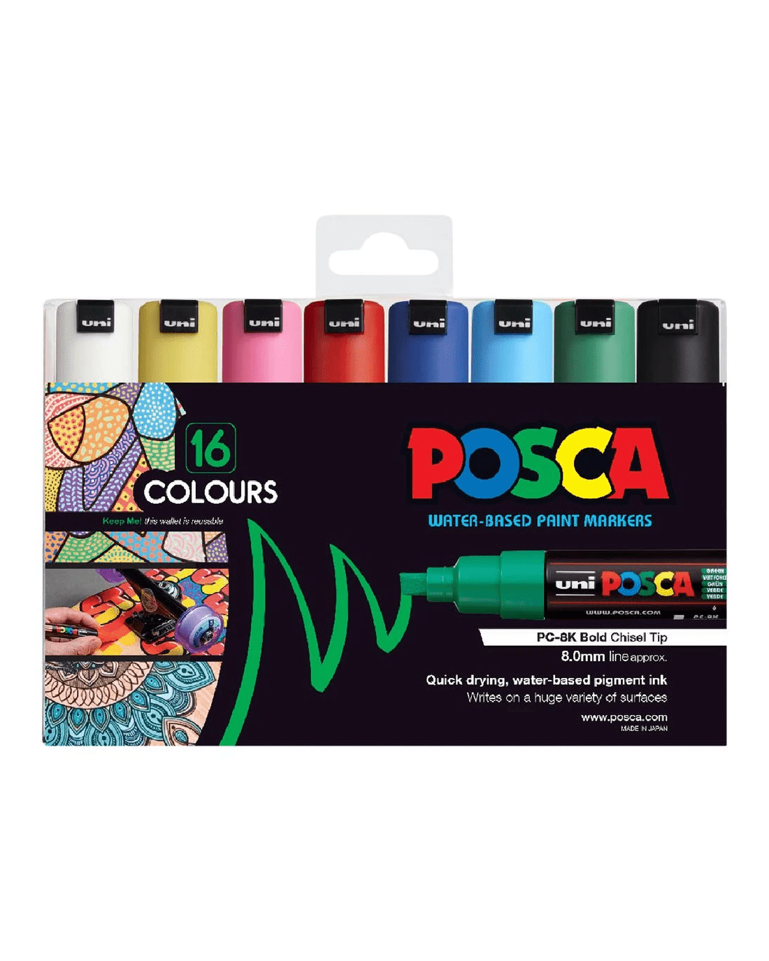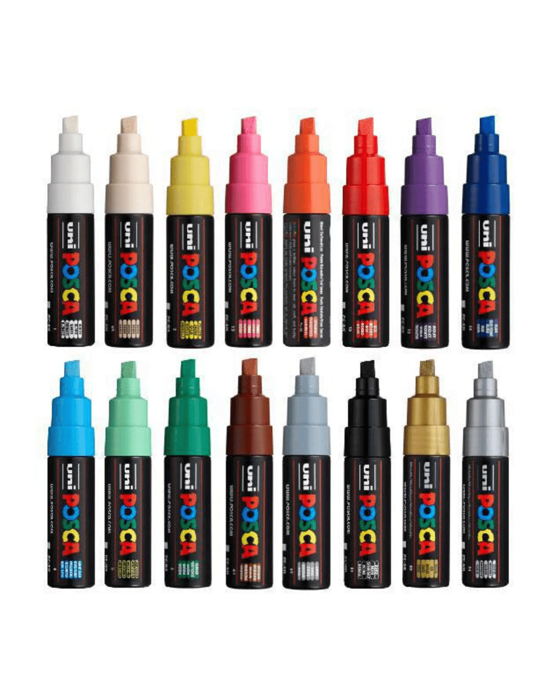 POSCA PC-8K Poster Markers have water-based pigments which can be blended when wet or overlaid when dry. Each marker has a chisel tip to produce thin lines on the point and thick, 8.0 mm lines on the side. Plus, they can be used on a variety of surfaces making them a versatile writing utensil.