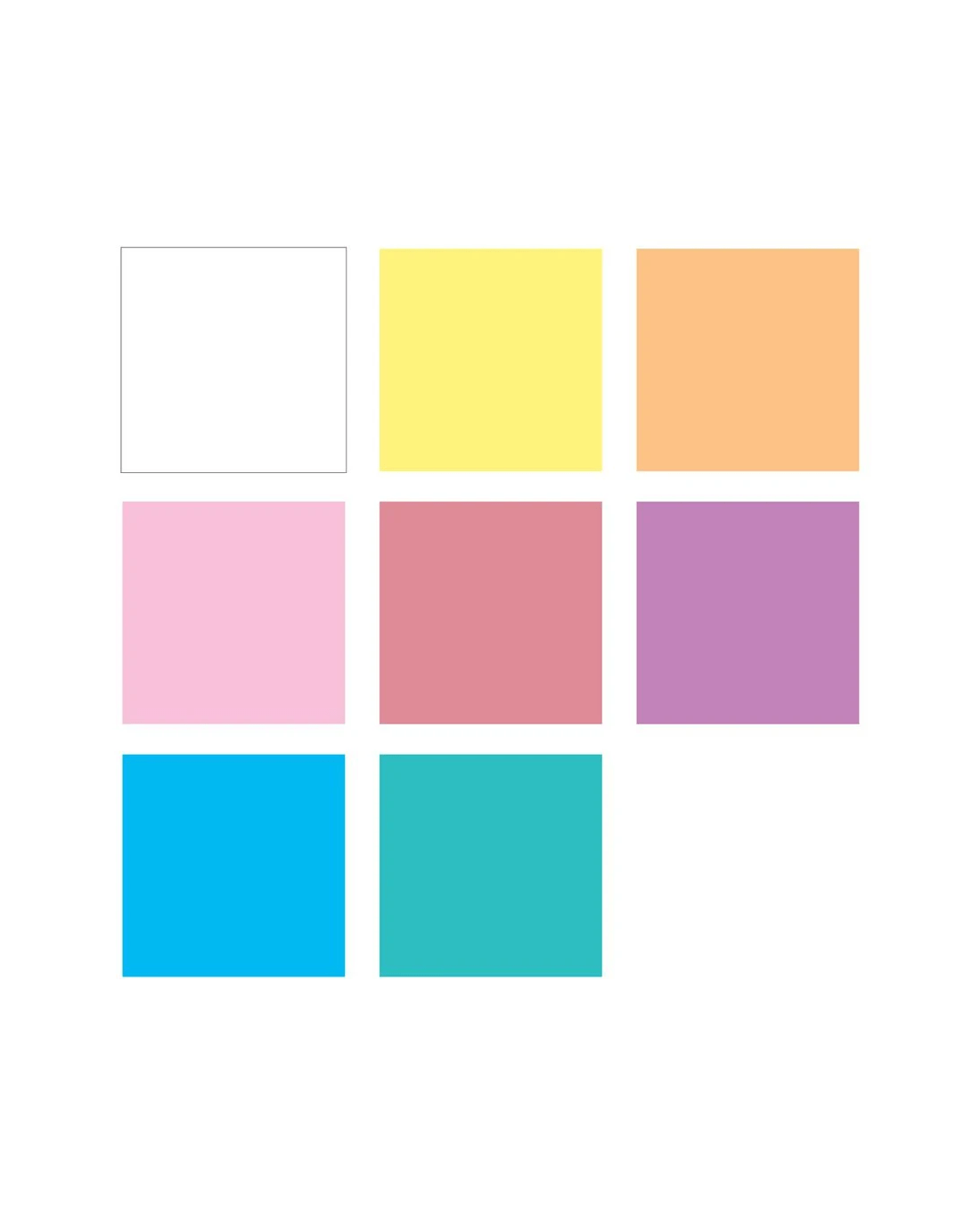 - The colours included in this pack are white, sunshine yellow, apricot, light pink, coral pink, lavender, light blue, and aqua green.