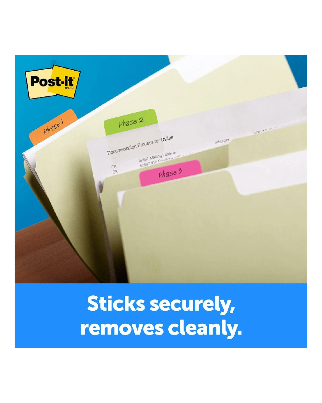 - Each tab can be removed and repositioned without leaving residue behind.