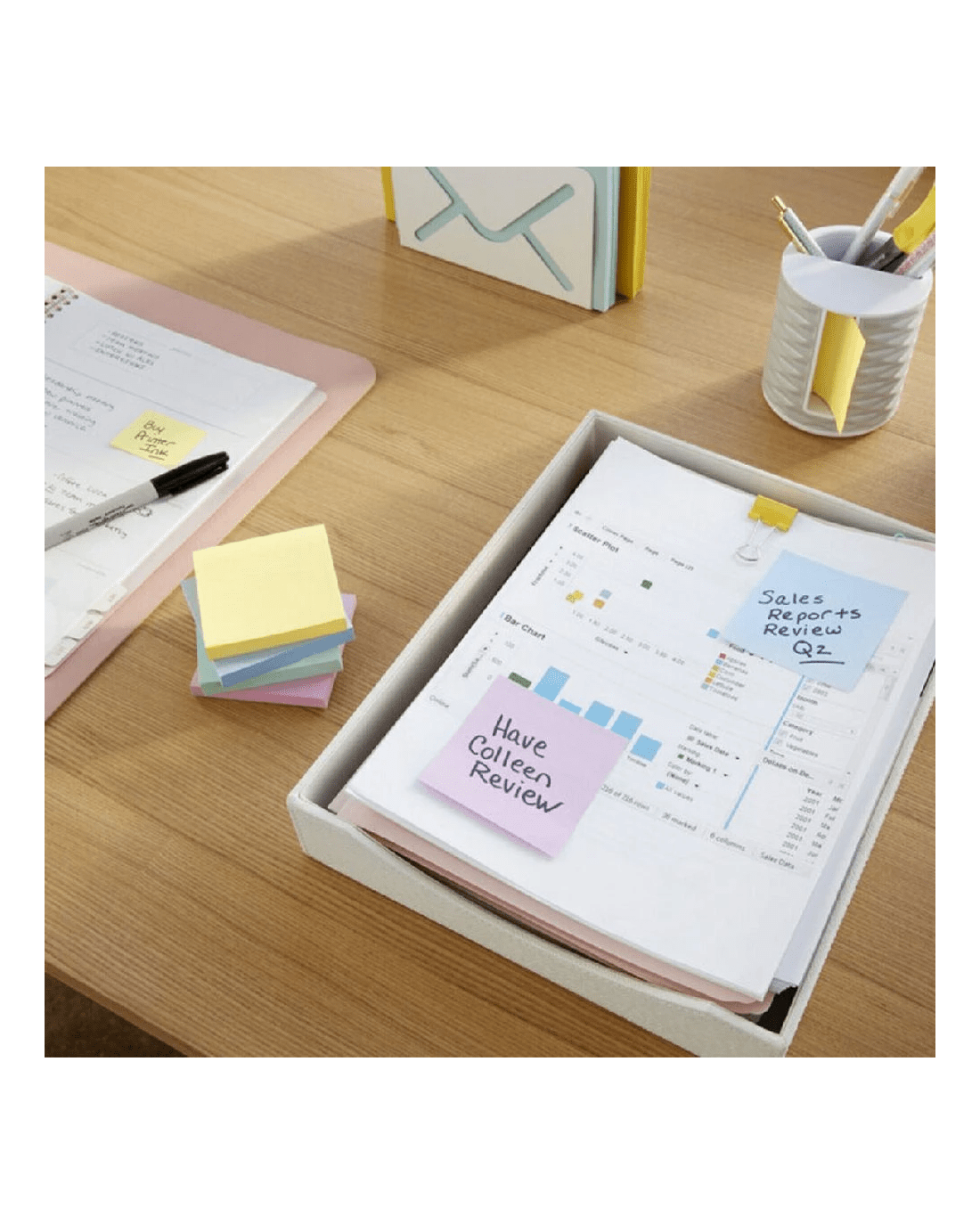 These Post-it Super Sticky Notes have an extra strong adhesive so you can be sure that your messages, reminders and lists will stay in place. These notes can be adhered almost anywhere and are ideal for use on vertical, textured and other difficult surfaces. They can easily be removed without leaving behind any residue and are repositionable so you can move your notes around.