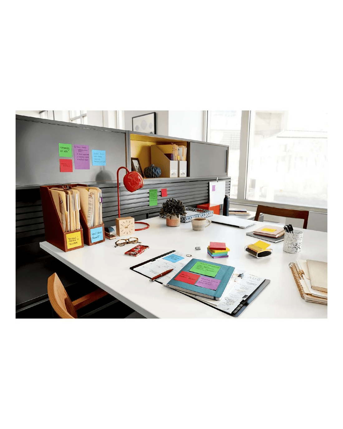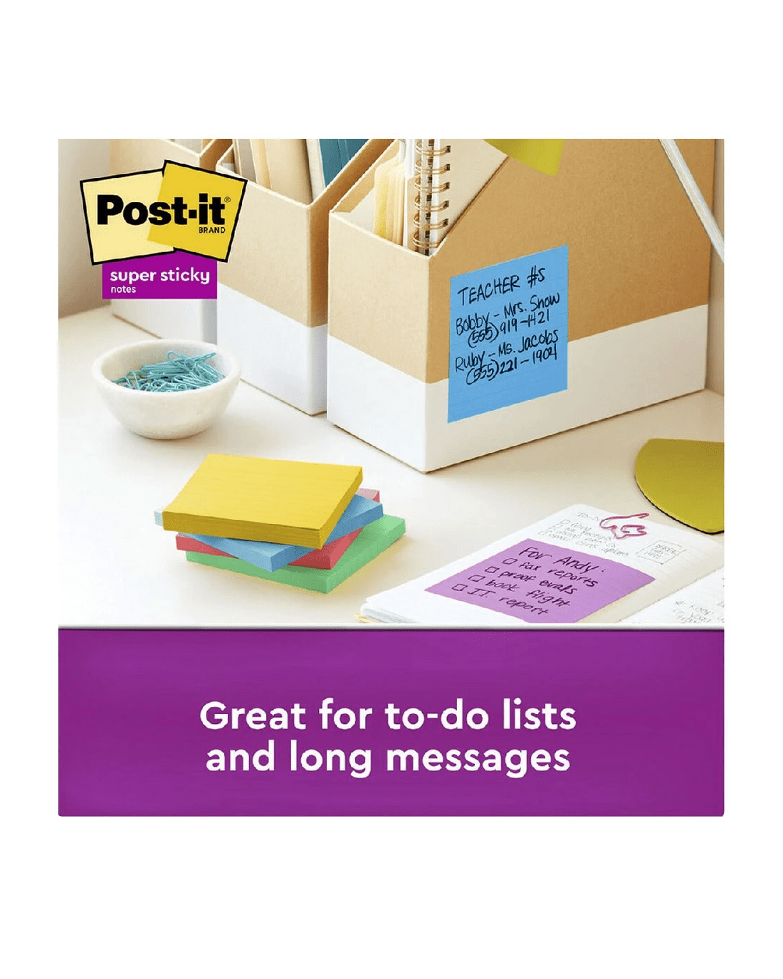 These Post-it Super Sticky Notes have an extra strong adhesive so you can be sure that your messages, reminders and lists will stay in place. These notes can be adhered almost anywhere and are ideal for use on vertical, textured and other difficult surfaces. They can easily be removed without leaving behind any residue and are repositionable so you can move your notes around.
