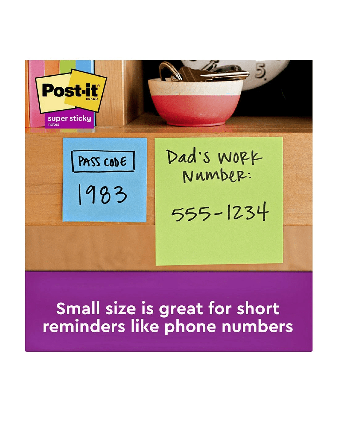 These Post-it Super Sticky Notes can be attached to cabinets, monitors, doors and walls so you can place your notes wherever you like. These notes adhere securely and can be quickly removed leaving no residue. These Post-its are part of the Rio De Janeiro collection adding a bright colour scheme to your workspace.
