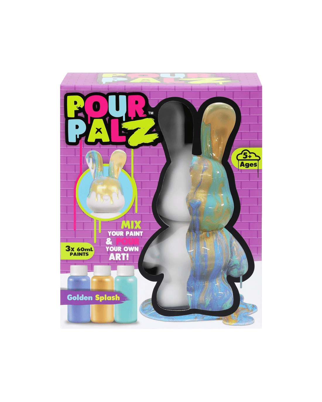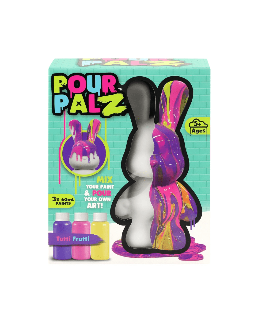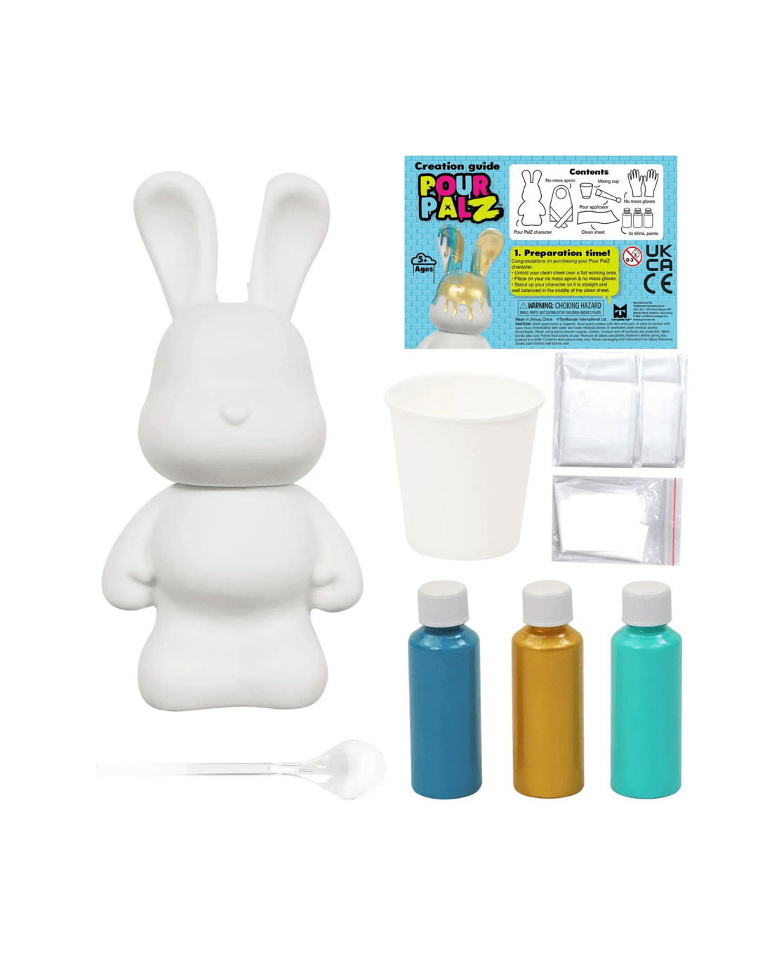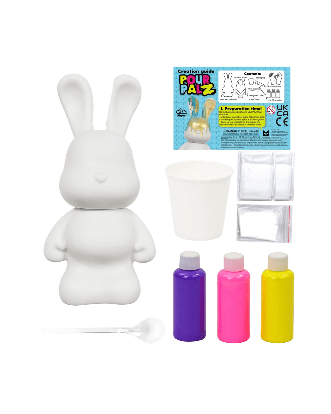 Pour Palz Diy Paint BunnyIncludes only 1 Pour Palz Fluid Paint CharacterIncludes 1 x poseable Pour Palz character, 3 x acrylic paints, 1 x pour spoon, 1 x mixing cup, 2 x no mess gloves, 1 x clean sheet and 1 x instruction sheetNet volume:Paints: 60ml (Each)Mix and pour paint colours over your character to create your one-of-a-kind collectibleLarge bear shapeWatch the marble effectUnique and personalised3 fun variants to collectDimensions/Size: 23cm (H) x 14.5cm (W) x 9.5cm (D)Suitable for ages: 5+ years