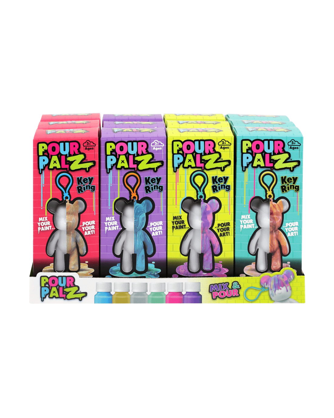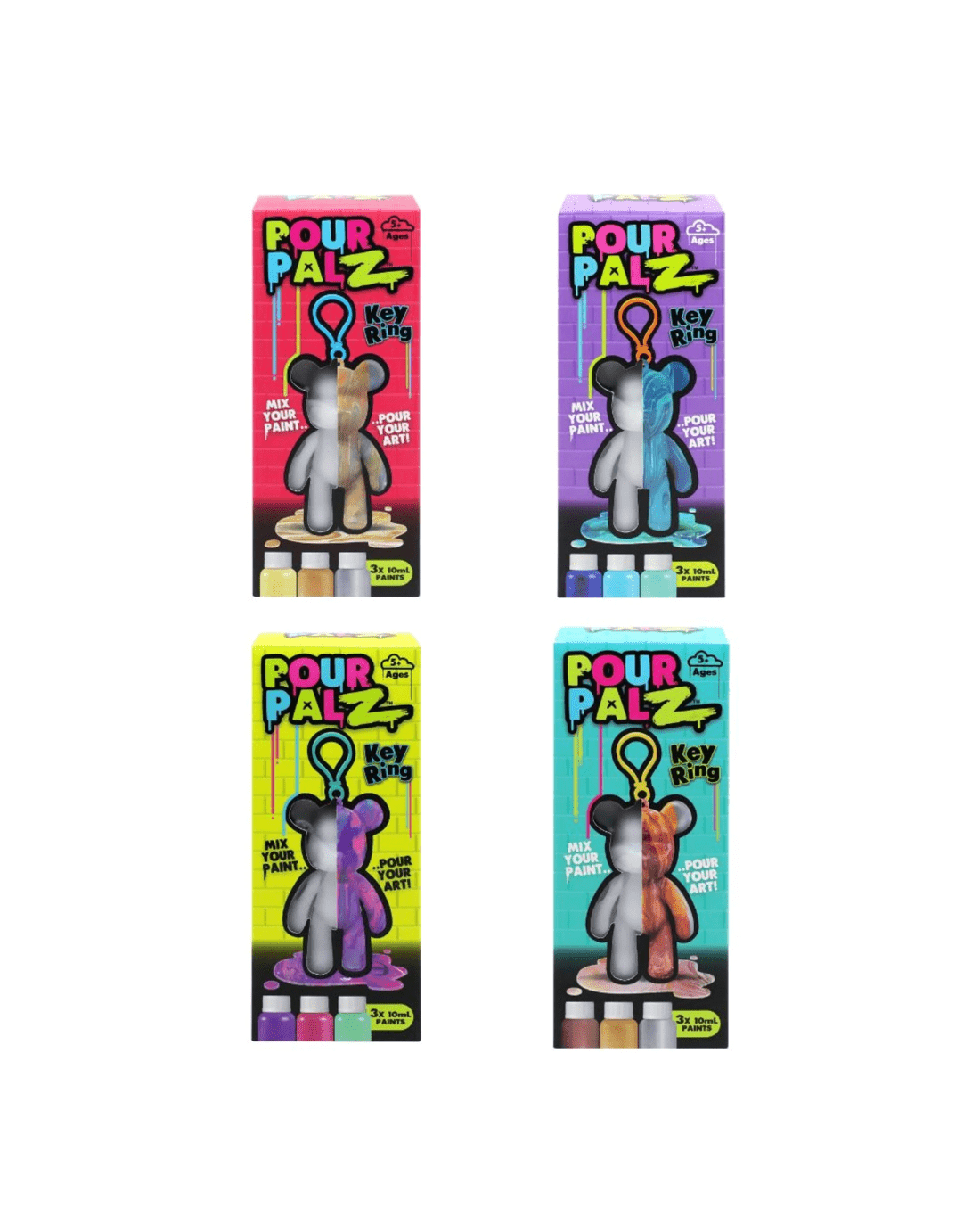 - Each box contains: 1 x Pour PalZ Mini Keyring, 1 x plastic keyring clip, 1 x pour spoon, 1 x mixing cup, 1 x pair of gloves, 1 x no mess clean sheet, 3 x 10mL acrylic paints and 1 x instruction sheet.