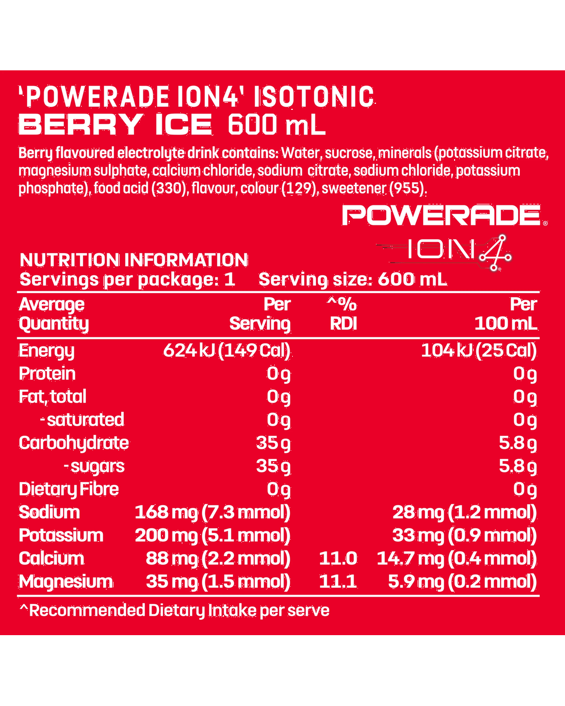 Sold by KmartPowerade ION4 Isotonic Berry Ice Sports Drink 600ml
