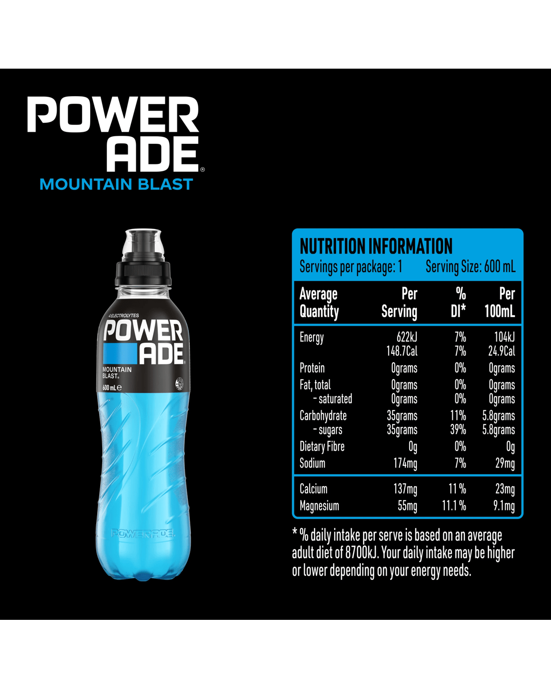 Sold by KmartPowerade ION4 Isotonic Mountain Blast Sports Drink 600ml
