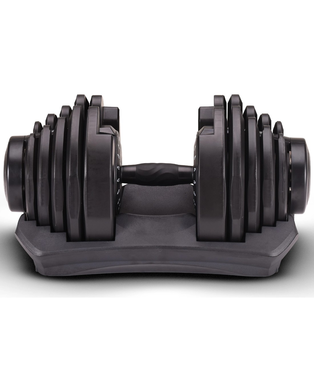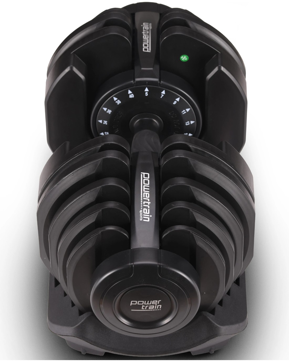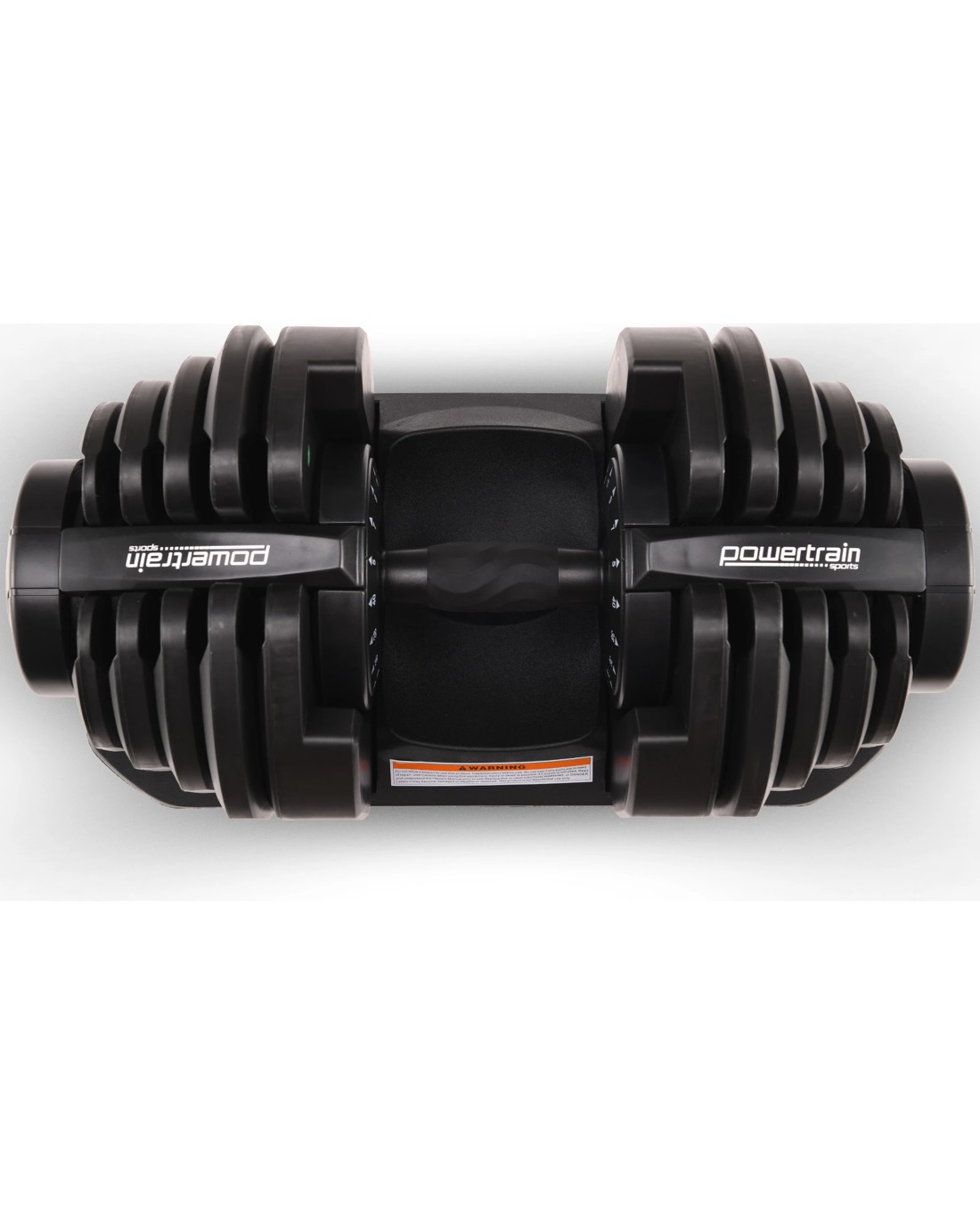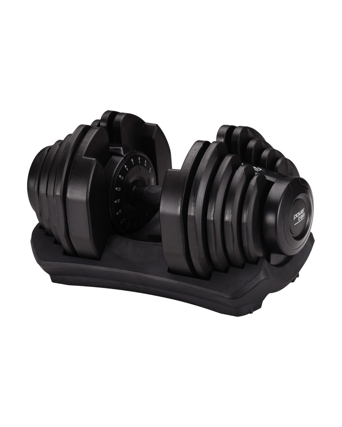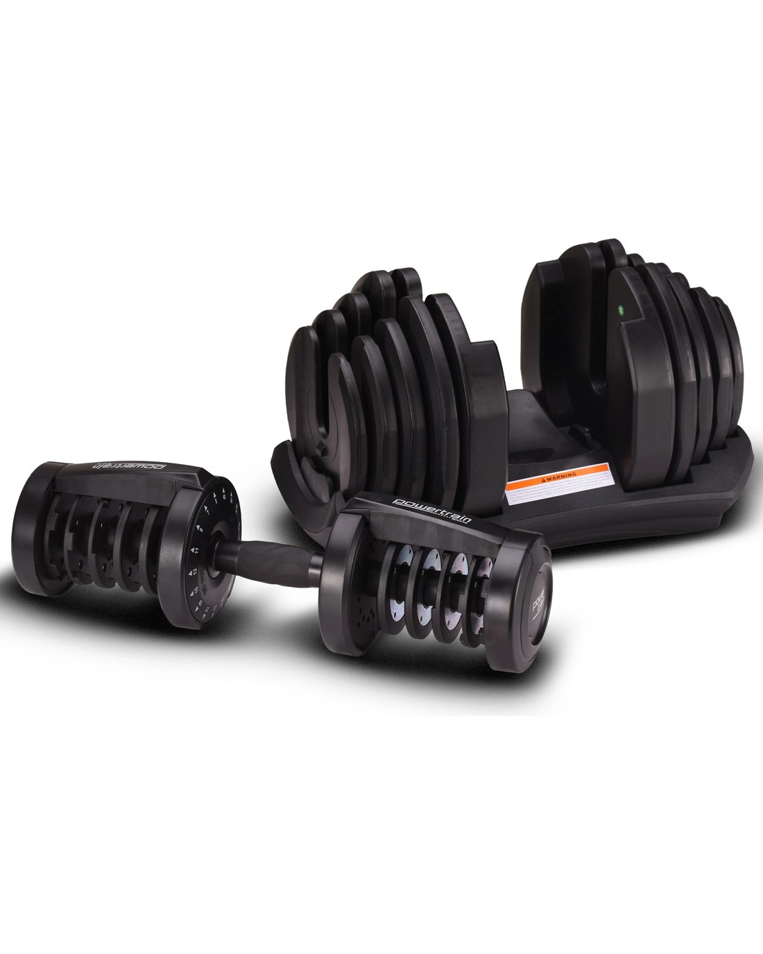 The Powertrain Adjustable Dumbbell's ergonomic design makes it the most space-efficient and flexible strength-training option available. With just the turn of a dial, you can automatically change your resistance on this dumbbell from 10 pounds all the way up to 90 pounds!