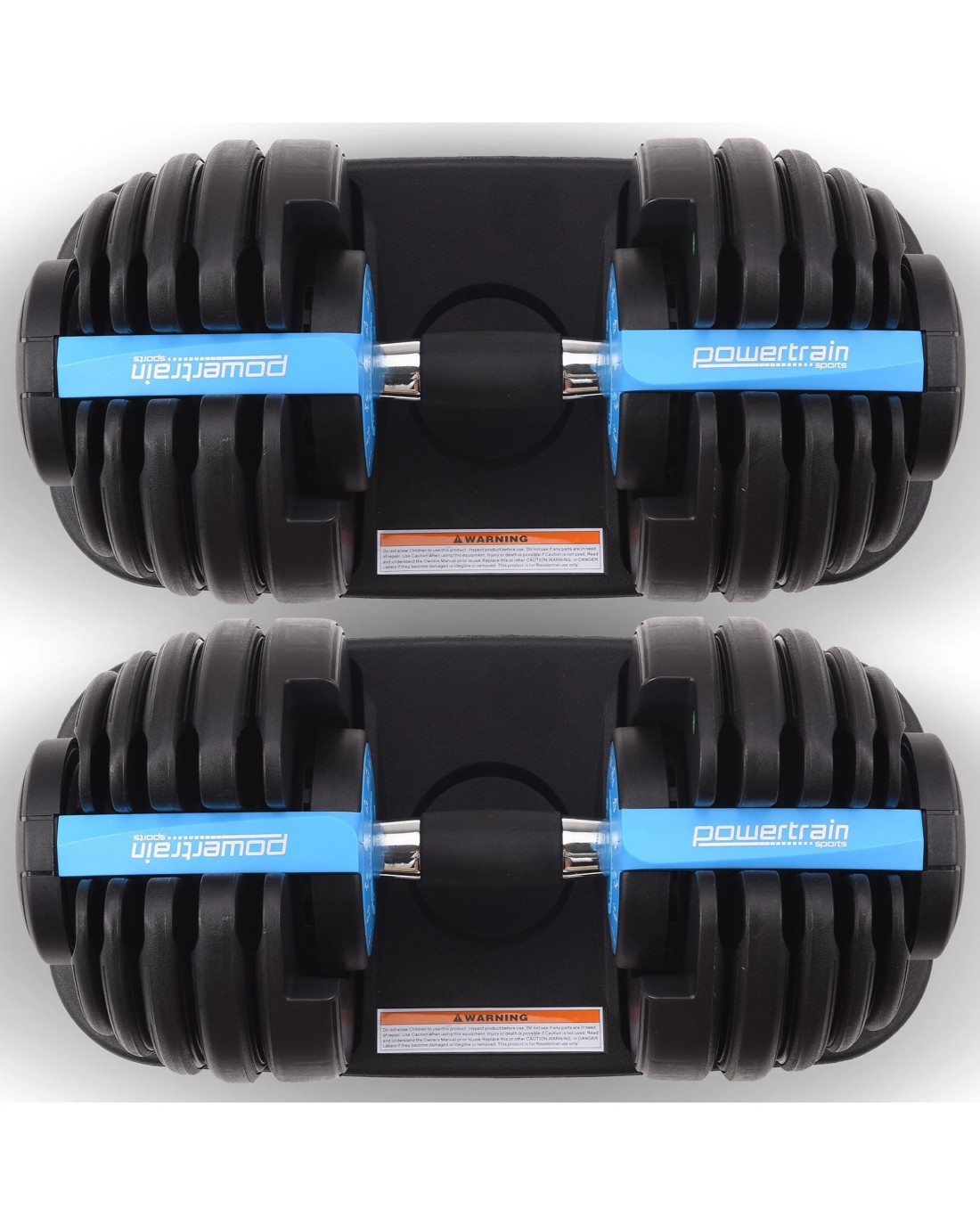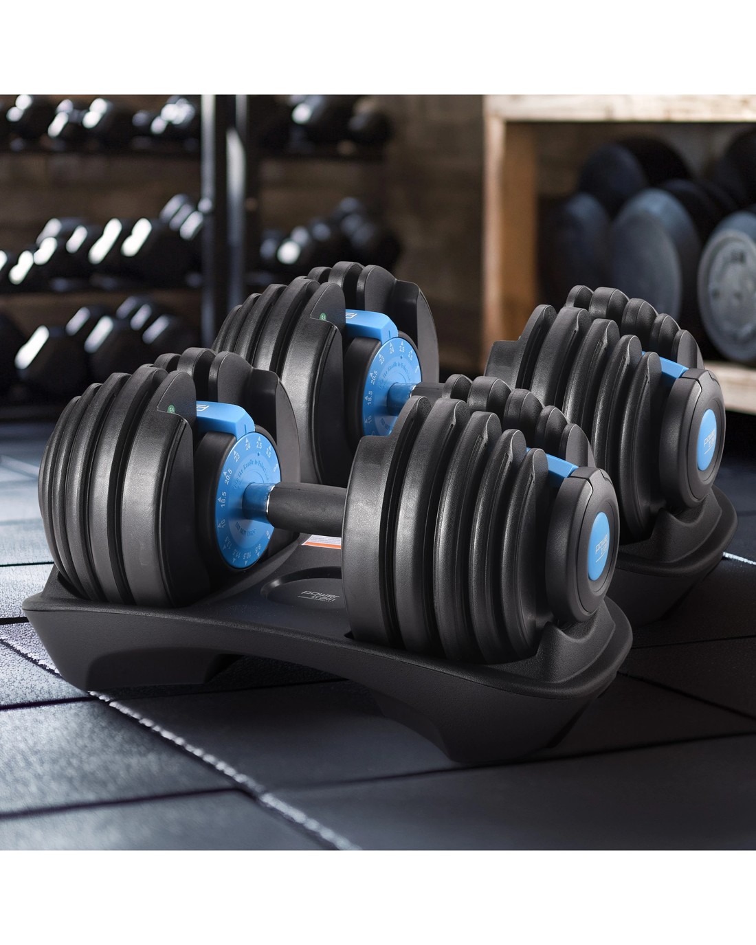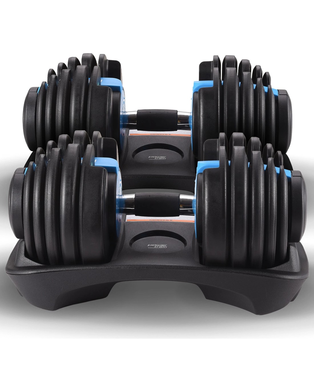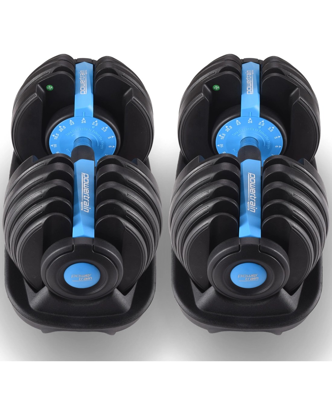 The PowerTrain Adjustable Dumbbell set's ergonomic design makes it the most space-efficient and flexible strength-training option available. With just the turn of a dial, you can automatically change your resistance on each dumbbell from 5 pounds all the way up to 52.5 pounds each.