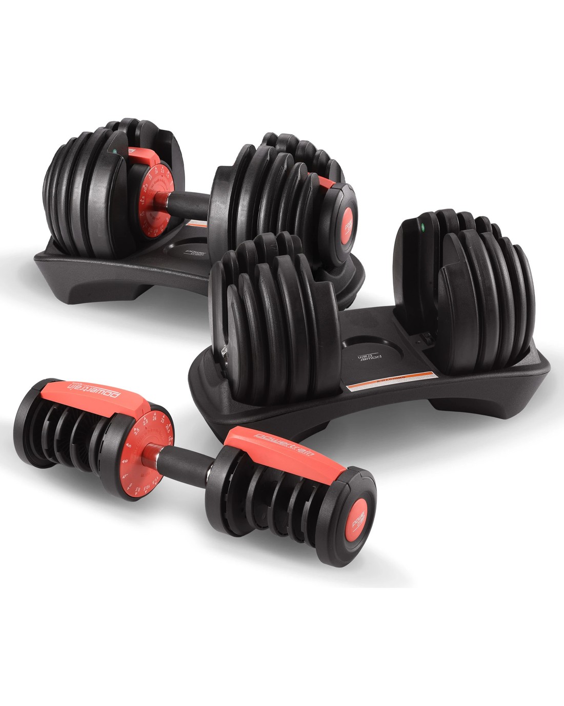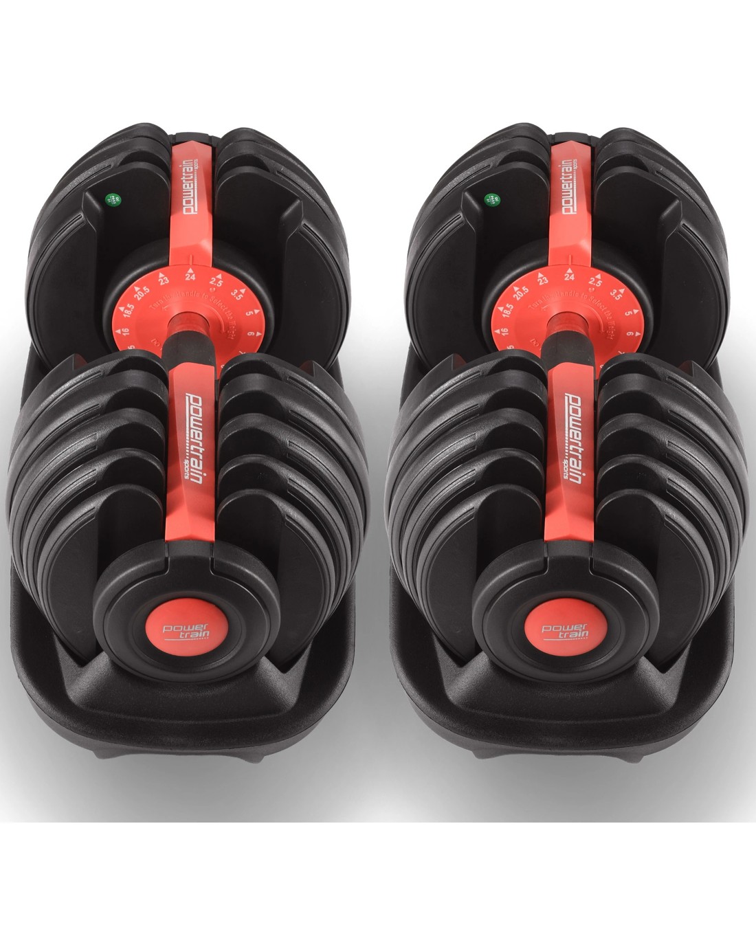 Train smarter with the Powertrain 15-in-1 adjustable dumbbell set, your all-in-one home gym solution. With a weight range from 2.2kg to 24kg for each dumbbell, it replaces a full rack of dumbbells in a compact design. Adjust weights easily and quickly with its innovative one-hand dial system so you can focus on circuits, supersets and dropsets without any hindrance. Built tough with a secure plate holder, theyre versatile, durable and perfect for long-term fitness.