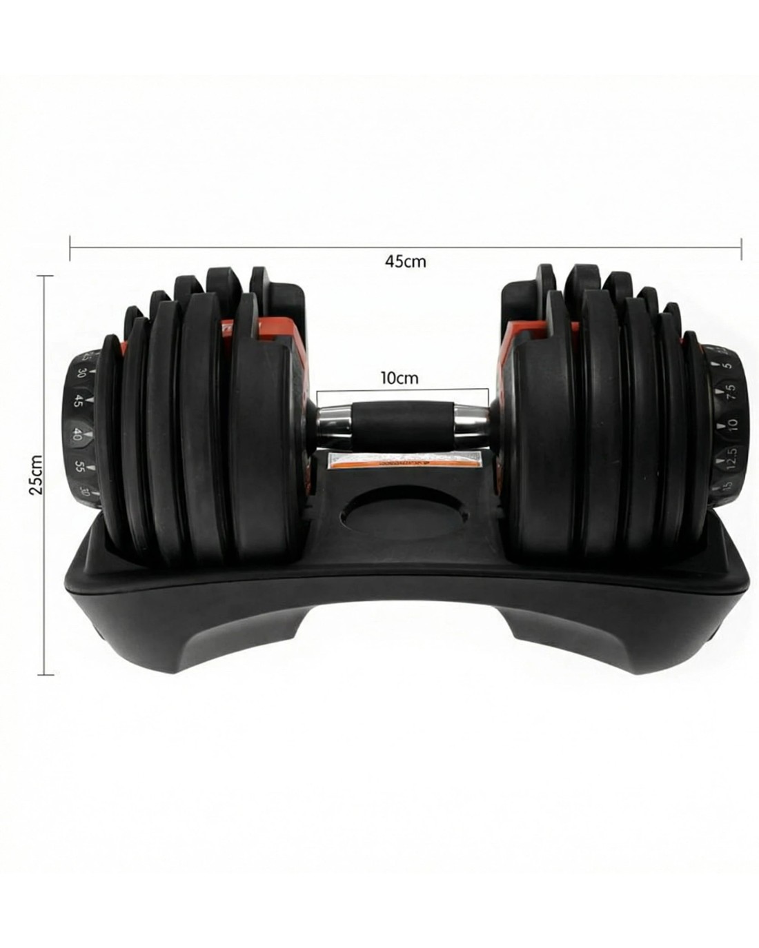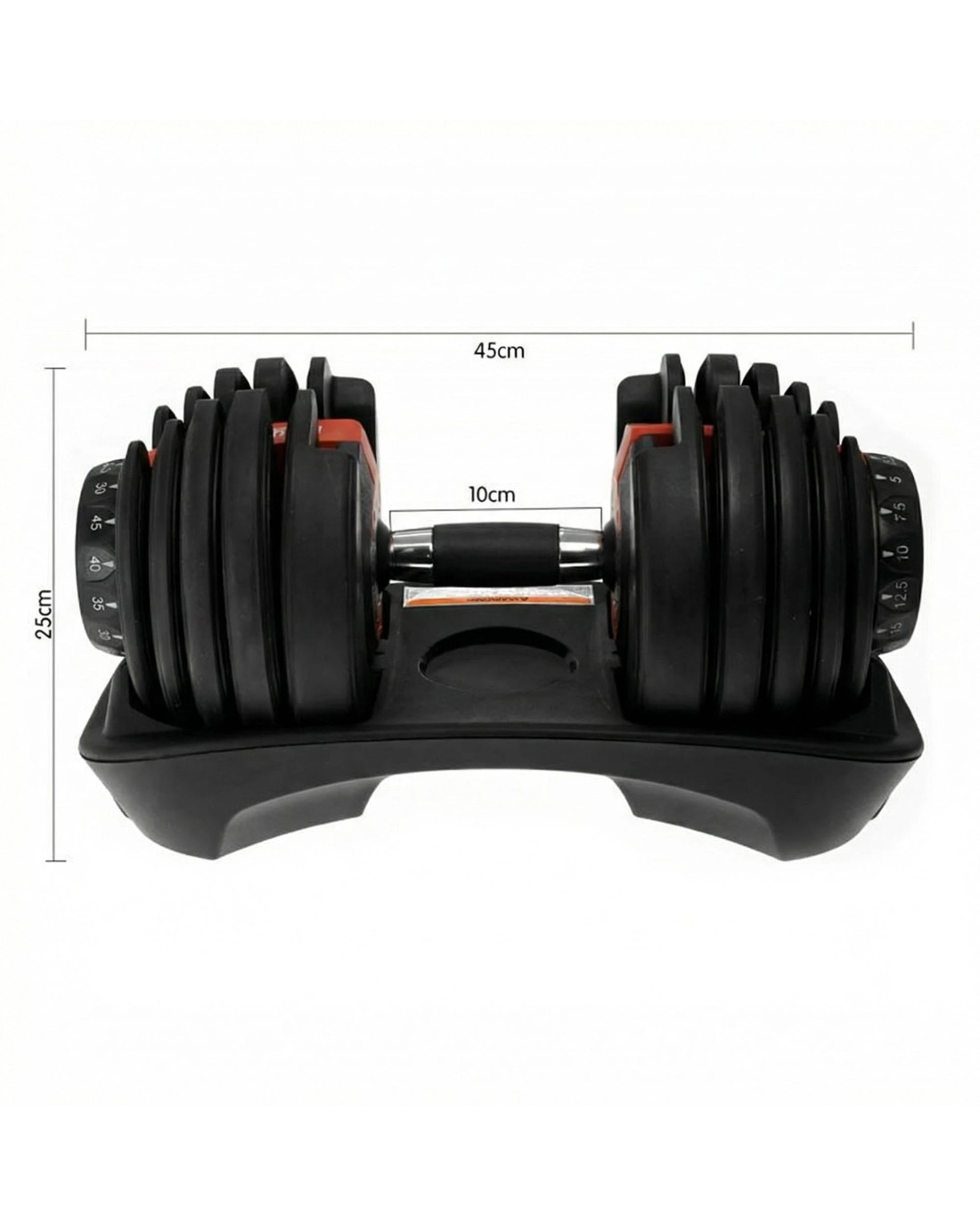 Each dumbbell has a weight range of 5kg to 40kg, making this set ideal for beginners to pro-lifters. The base keeps the weights organized for easy access and switching.