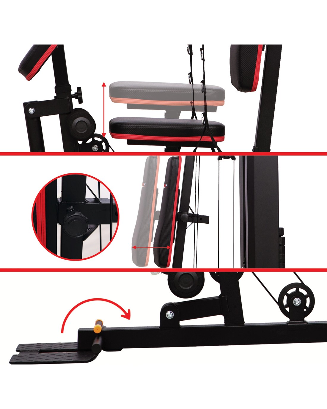 With an adjustable seat pad, backrest and leg press plate, this home gym ensures that you work out safely and comfortably. It also comes with a pull-down bar, rower attachment, ankle strap and a preacher curl pad everything you need for an all-around workout.