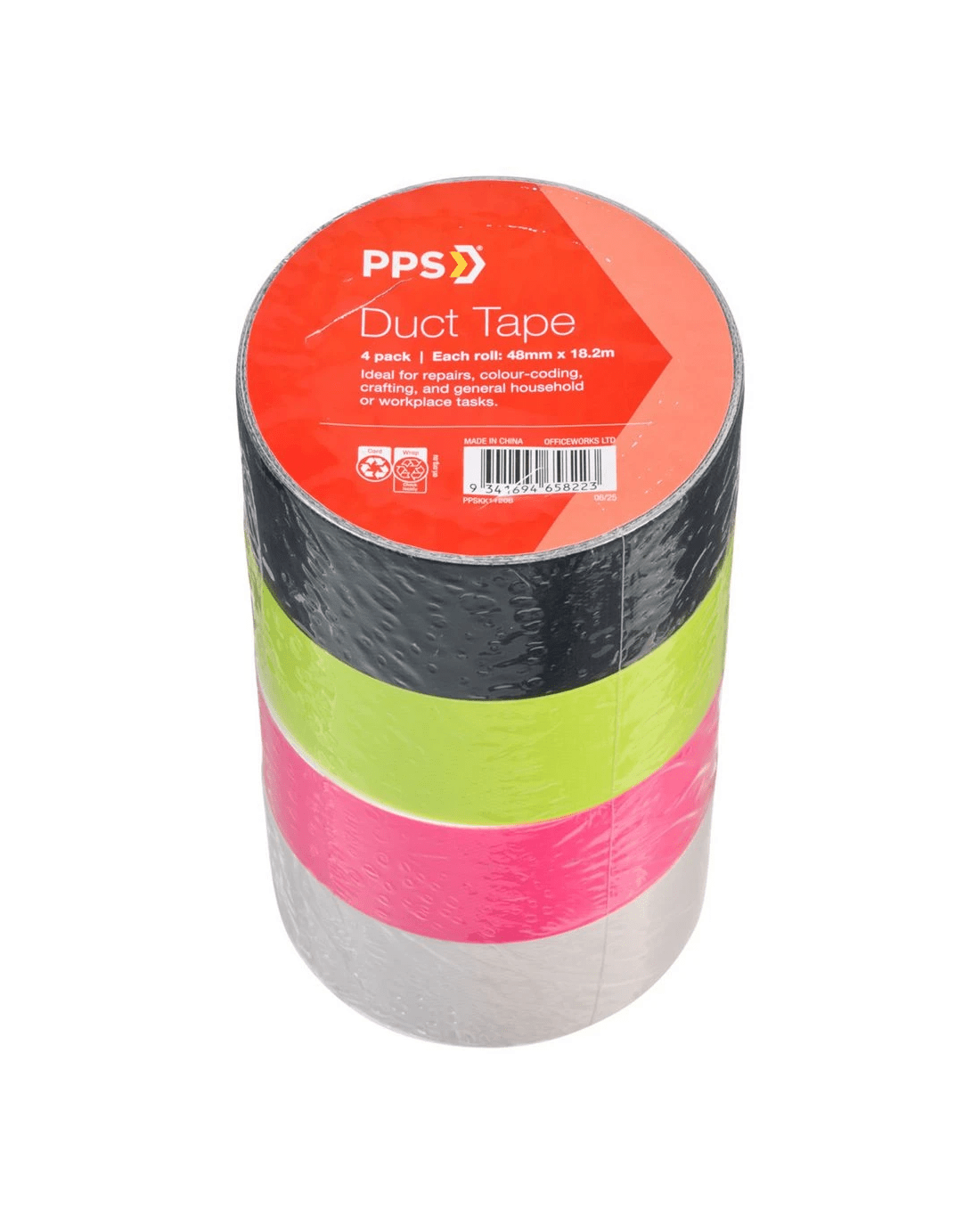 This PPS Duct Tape is perfect for general sealing, sticking and joining tasks. This sturdy, durable tape will stand up to most kinds of jobs. The pack includes four 18 metre rolls in a variety of colours.