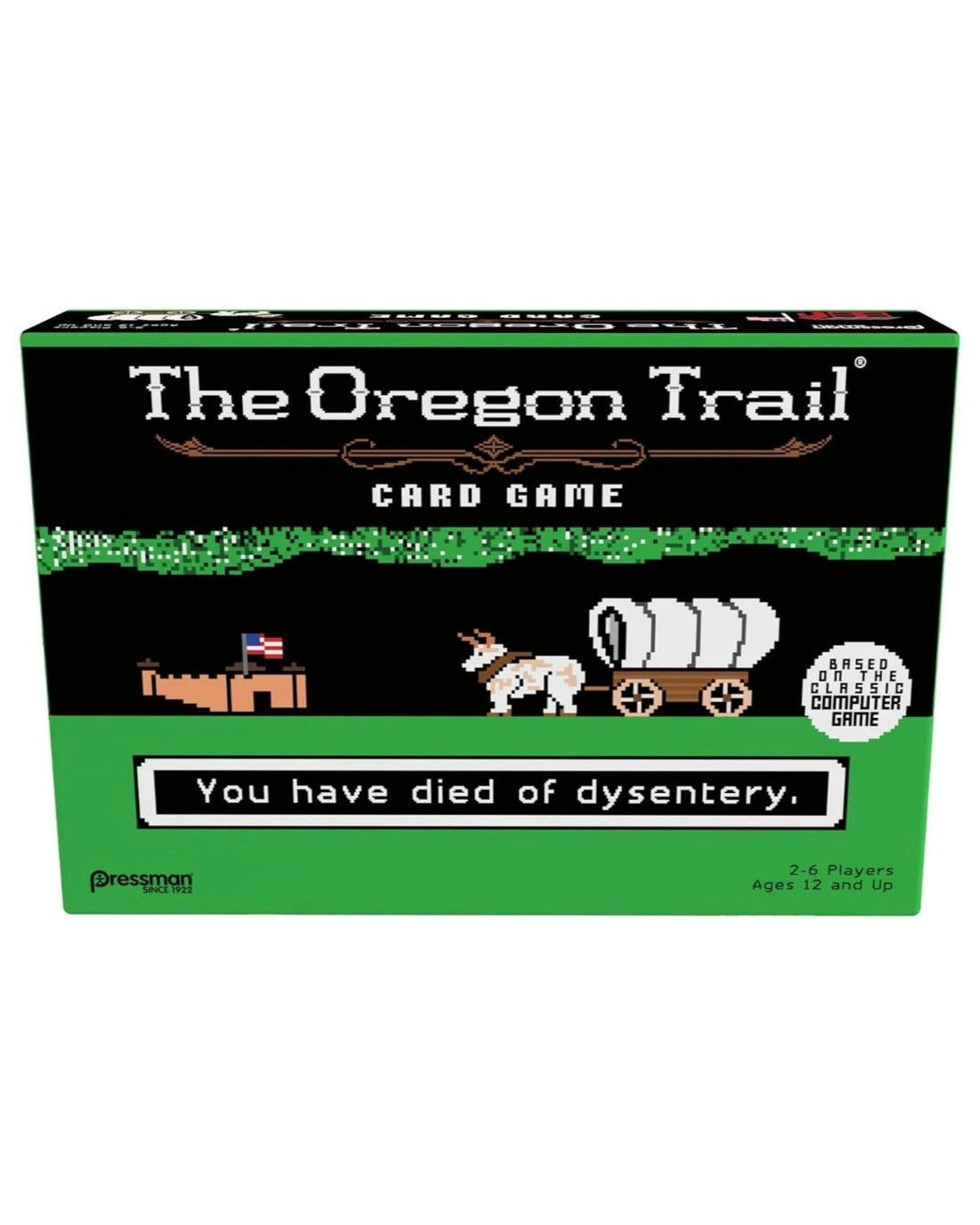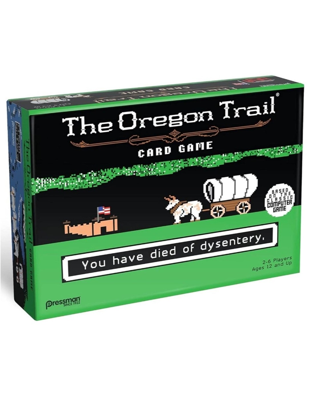 All sorts of gruesome deaths await you and the rest of your wagon party in this official multi-player card game version of the classic computer game. To win you'll need to keep one player alive all the way from Independence, MO to the Willamette Valley. But between rattlesnakes, starvation, dead oxen, broken bones, dysentery, and a host of other calamities the odds are long . . . almost as long as the Oregon Trail itself. Players work together to move along the trail, fording rivers and playing Supply Cards to overcome calamities. But be warned-there will be times when it makes sense to let one of your wagon mates succumb to a calamity rather than expend precious supplies. And every time players go the way of all flesh, you'll flip over the roster card and write their names on tombstones (don't forget to include a quick epitaph). It's a great way to relive your fond memories of one of the world's most beloved computer games, and to kill off your family and friends at the same time. Ages: 12 + | Players: 2 - 6 | Playtime: 30 - 45 Mins