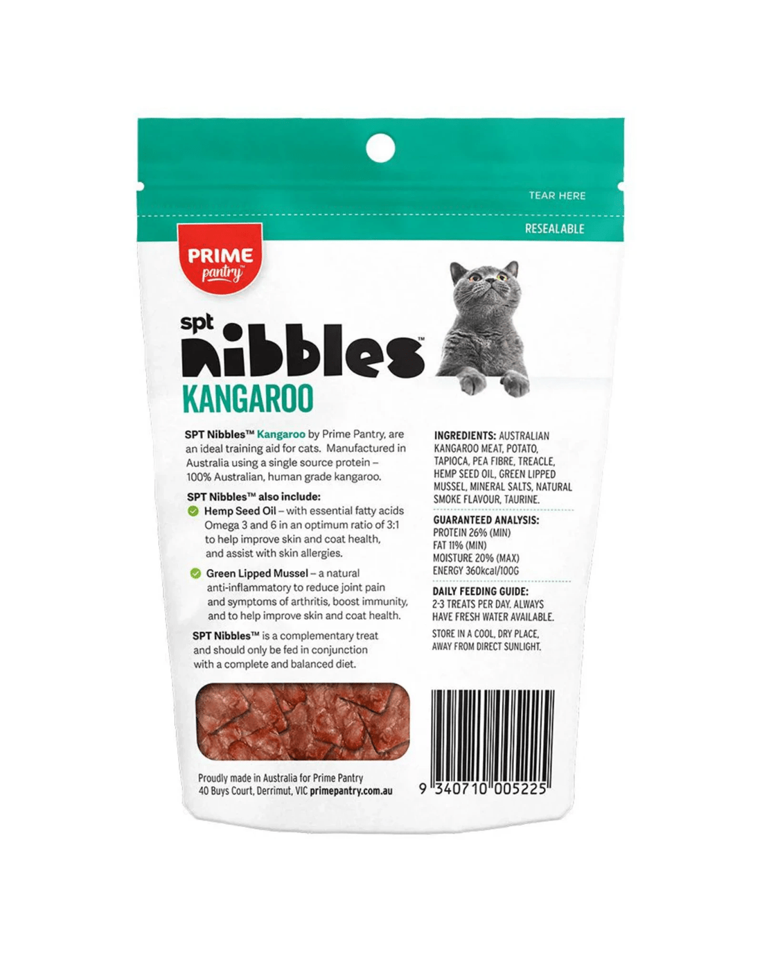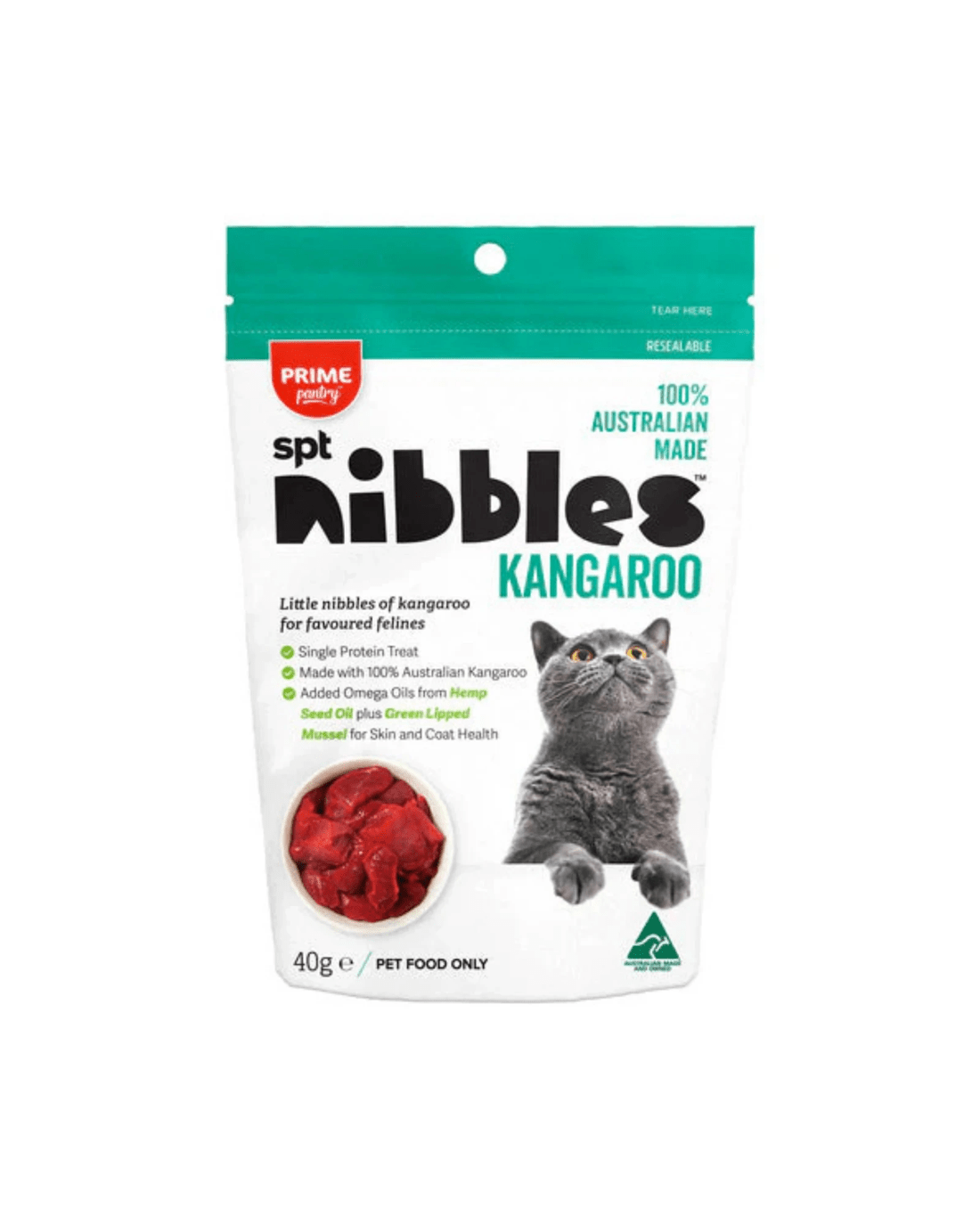 Prime Pantry SPT Nibbles Cat Treats are the perfect training and reward treats for cats. Made in Australia with a single-source protein—100% Australian, human-grade chicken, duck, kangaroo, or salmon.