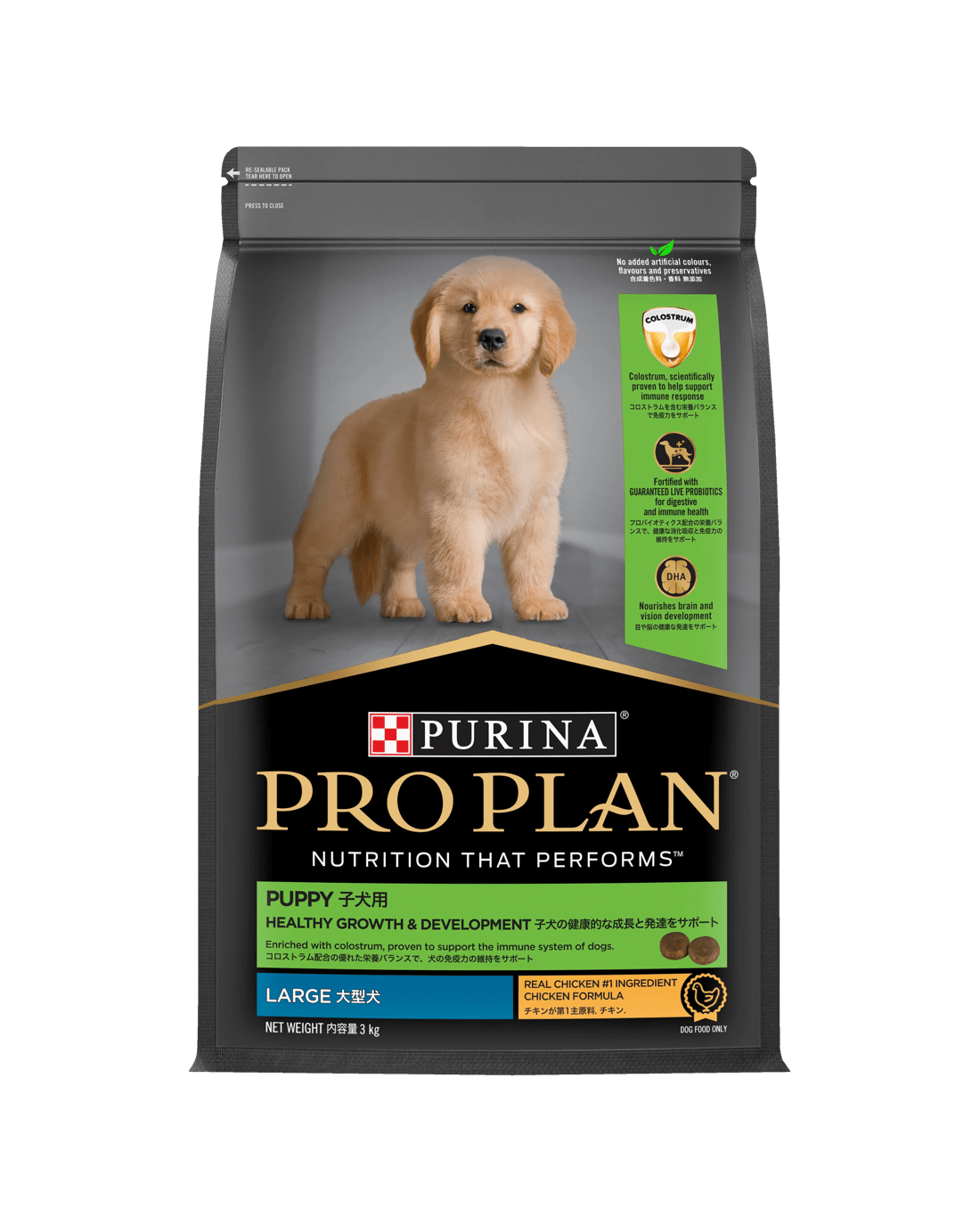 PRO PLAN Puppy Healthy Growth and Development Large Breed Dry Dog Food with Chicken PRO PLAN formulas use the power of science to provide your puppy with optimal nutrition for a life of health and vitality. This premium dry puppy food is made from high quality ingredients, including real chicken as the #1 ingredient, and contains all the essential nutrition your large breed puppy needs to grow and develop. It is fortified with colostrum for enhanced immunity and protection from common intestinal upsets, as well as a combination of key nutrients to support healthy joints. This nutritionally optimized recipe is made in Australia and is free of artificial colors, flavors and preservatives. PRO PLAN Puppy Healthy Growth and Development Large Breed Dry Dog Food contains the correct balance of calcium, phosphorus and energy to support controlled growth in large breed puppies.