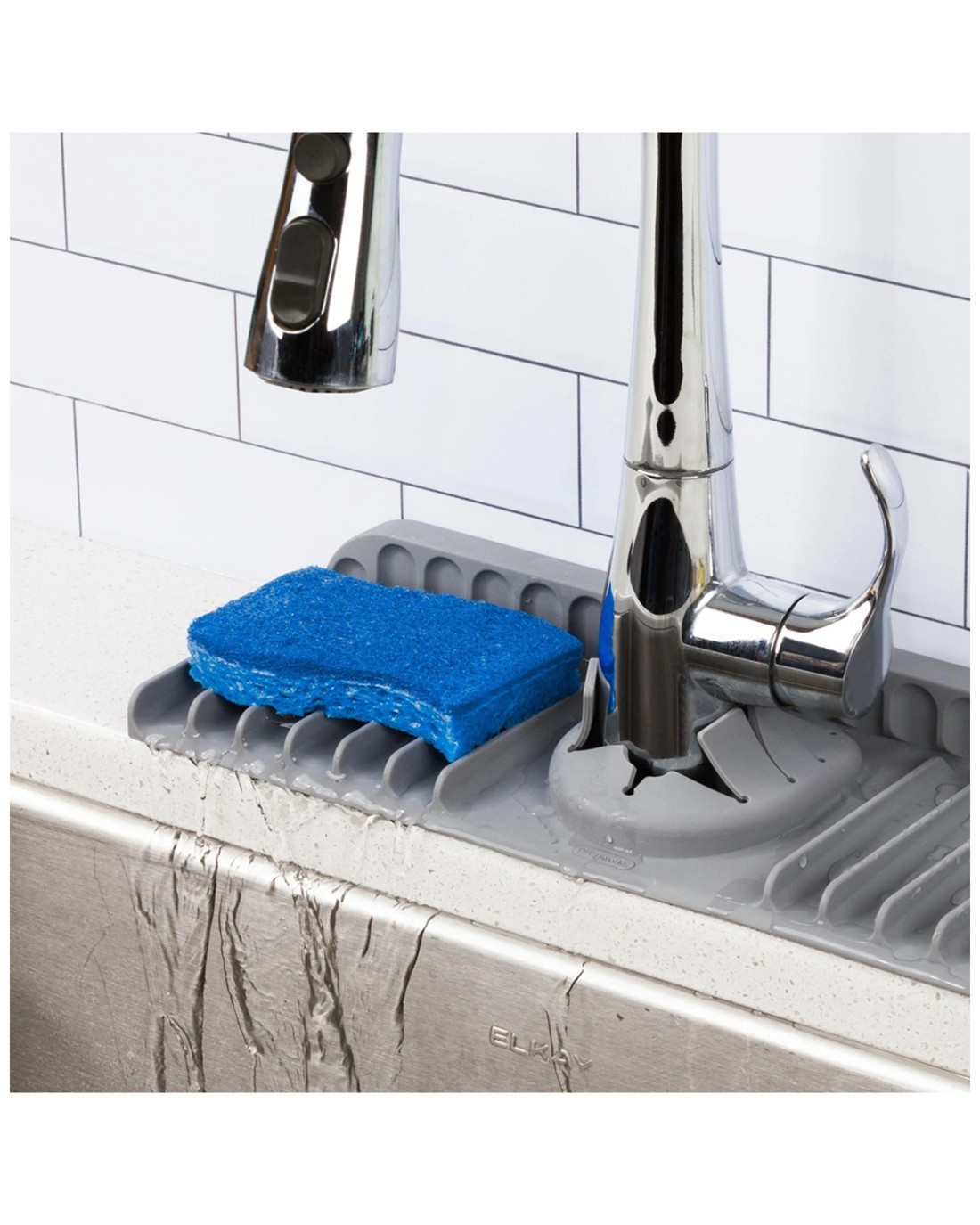The PROGRESSIVE Silicone Sink Mat with Splash Guard is designed for effective water management and kitchen organisation. It helps keep your countertops dry and clean while providing a practical solution for drying small sink-ware and protecting your backsplash. This versatile sink mat features a faucet splash guard that fits around most sink faucets to catch drips and offers a dedicated space for draining and drying items. The foldable rear section provides extra protection for your backsplash from water splashes, helping to maintain a tidy kitchen area. The drying fins elevate soaps and sponges, promoting improved airflow and faster drying, which supports hygiene and reduces clutter. Its adjustable placement ensures a snug fit on most sinks, making it easy to use and customise for your space. Key Features: Faucet Splash Guard: Fits around most sink faucets to catch drips and provides a space to drain and dry small sink-ware items. Foldable Rear Section: Helps protect kitchen backsplashes from water splashes, keeping your kitchen cleaner. Drying Fins: Lift soaps and sponges for improved airflow and faster drying. Adjustable Placement: Designed for better adjustment and perfect fit on most sinks. Specifications: Brand: Progressive Product Type: Kitchen accessories Features: Sink splash guard, foldable rear section, drying fins, adjustable fit Note: Sponge not included Includes: