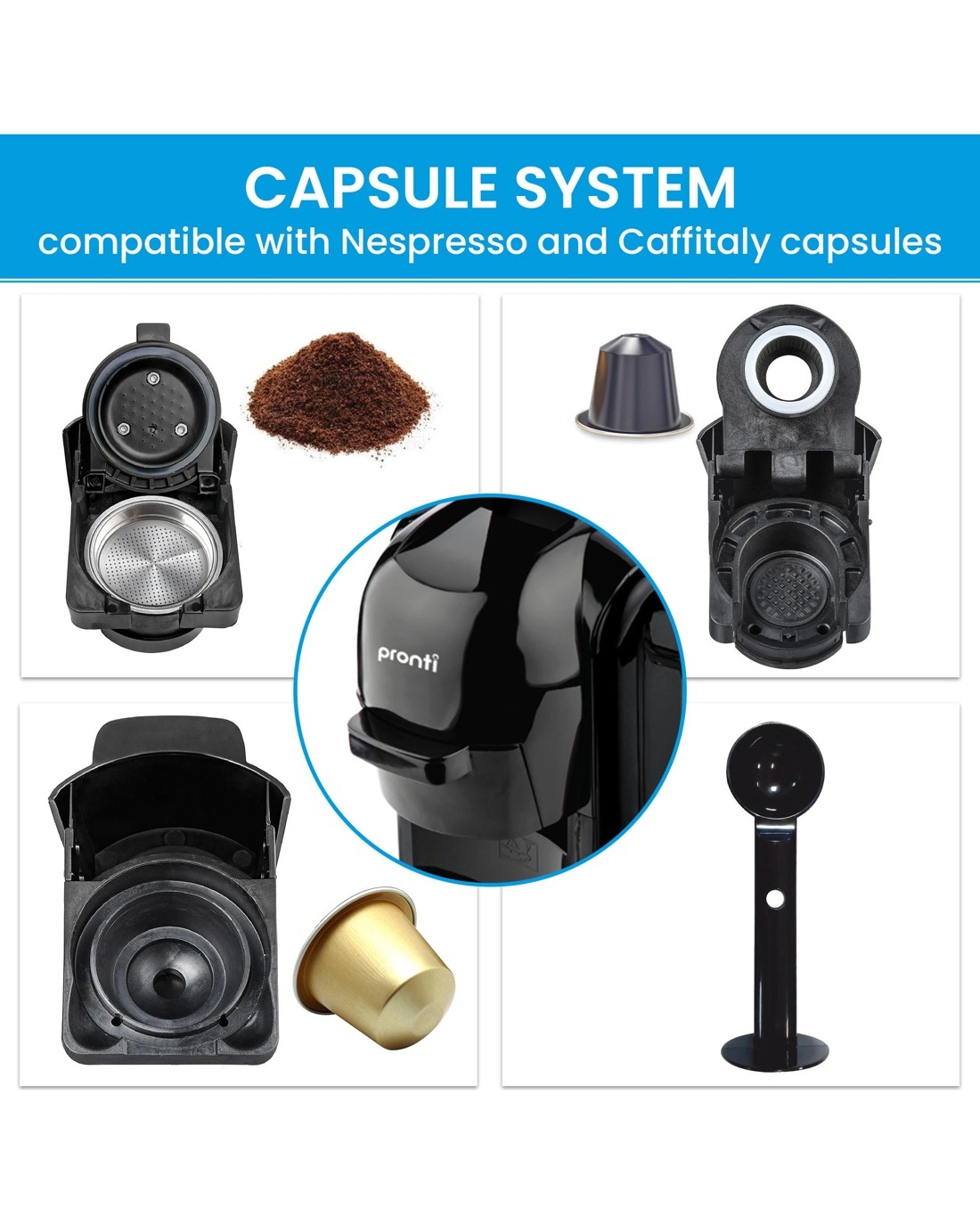 - Compatible with coffee grounds, Nespresso and Caffitaly capsules