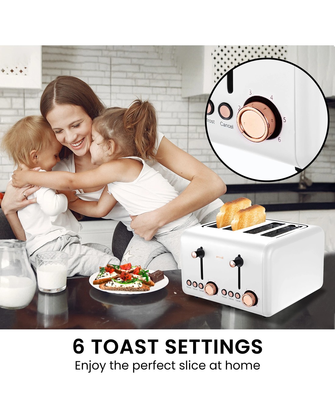 The Pronti kettle showcases an elegant rose gold accent and a 1.7L capacity, enabling you to swiftly boil up to six cups of water using its 2.2kW heating component. Equipped with a detachable filter, water-level indicator and cord storage, it offers added convenience. The 4-slice toaster comes with adjustable browning settings, a removable crumb tray, reheat and cancel functions, and a defrost option. Featuring double anti-jam and automatic shut-off, this set ensures your mornings are going smoothly without a hitch.