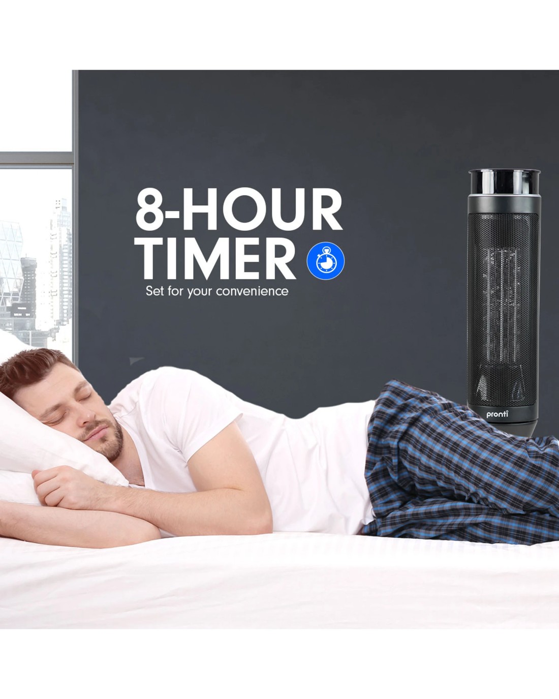 Oscillating base keeps the heat distributed equally across the room. Its timer function allows you to set the length of operation from 1 to 8 hours.