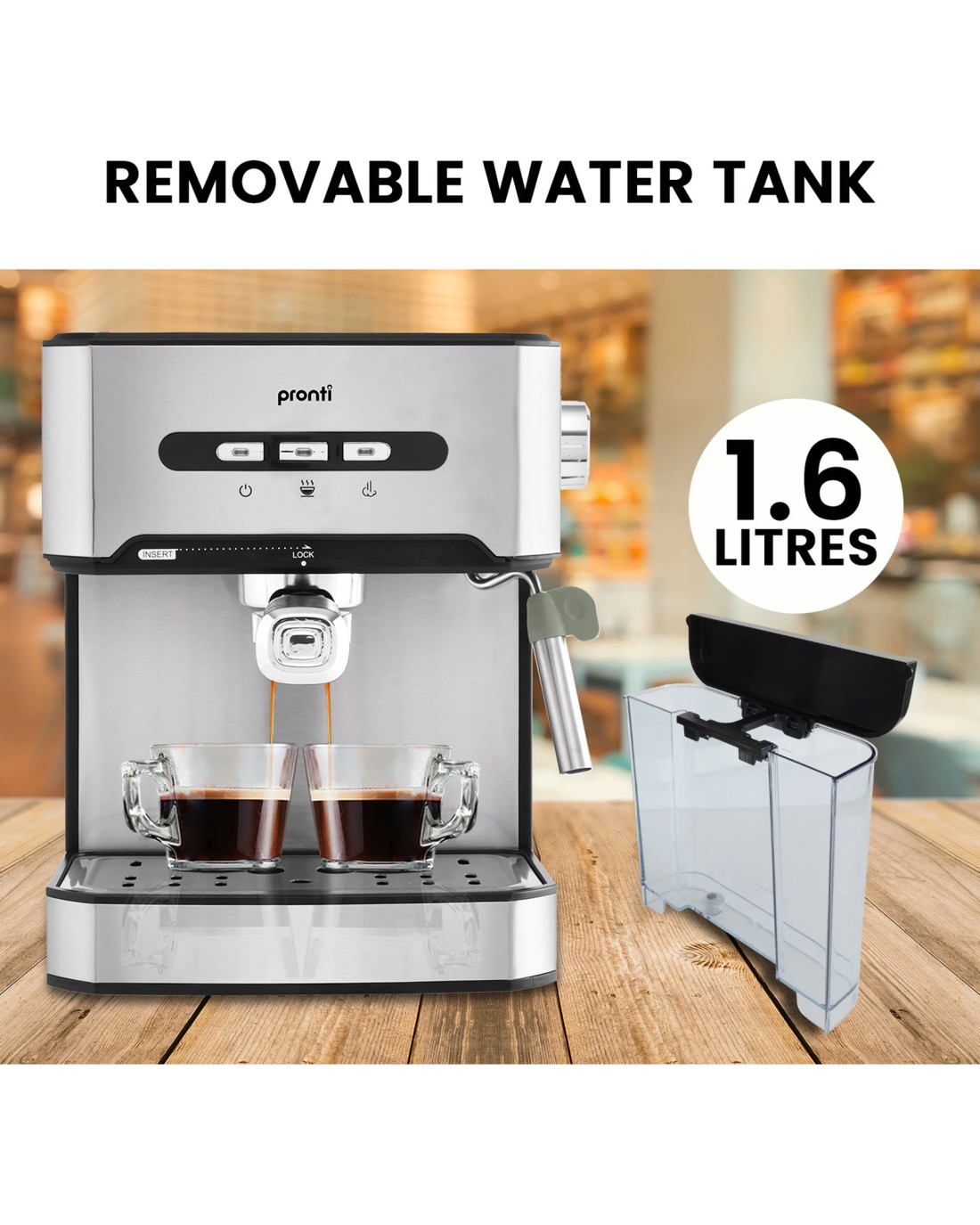 In the mood for a cappuccino? Pronti's 1.6L espresso machine features a built-in steamer wand to produce delicious and frothy milk for your coffee!