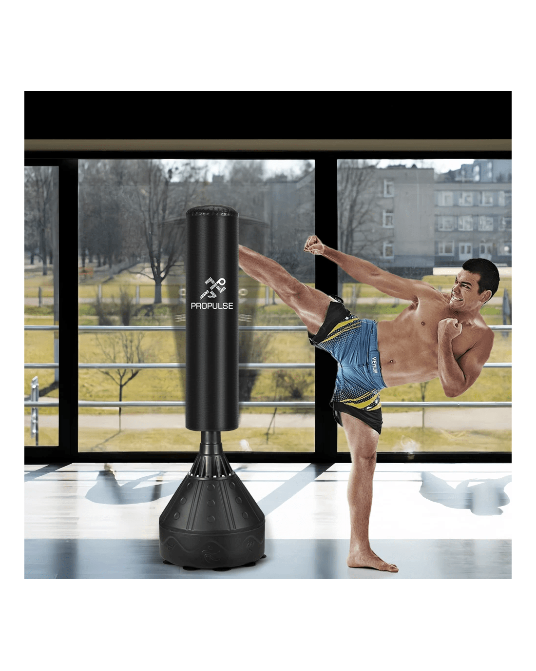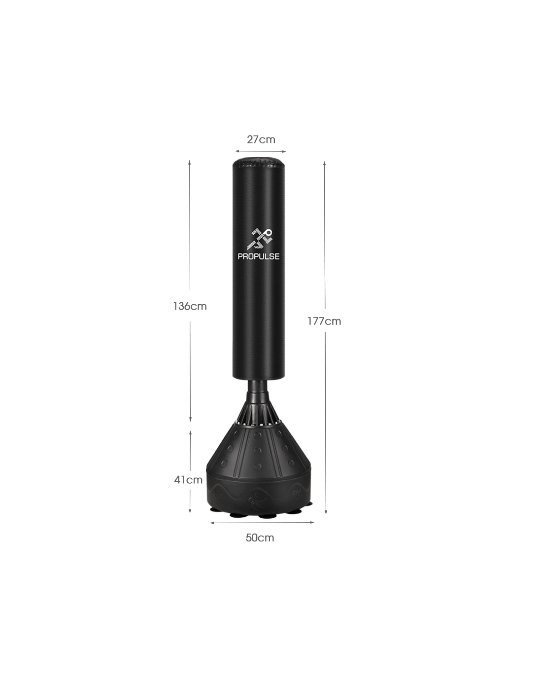 Fret about the crowded gym to wait for your turn or feel rushed during your workout? With our Propulse freestanding punching bag, you can kiss those worries goodbye. It is designed to instantly transform your home into a personal gym, allowing you to boost your speed, endurance, and power on your own schedule. Spare yourself the hassle of dealing with ceiling hooks or wall mounts-simply set it up and start your workout. Engineered for versatility, it stands at 177cm, catering to fitness enthusiasts of all ages. Its robust base, featuring 10 suction cups, ensures a firm grip on the ground, letting you unleash your full potential without slipping or wobbling. The bag is constructed with four layers: high-density PU leather, shock absorber, durable EPE foam, fabric buffer, providing durability against powerful strikes while offering excellent shock absorption and rebound. Its base, fillable with water or sand, acts as a stable anchor, ensuring stability during intense training sessions.