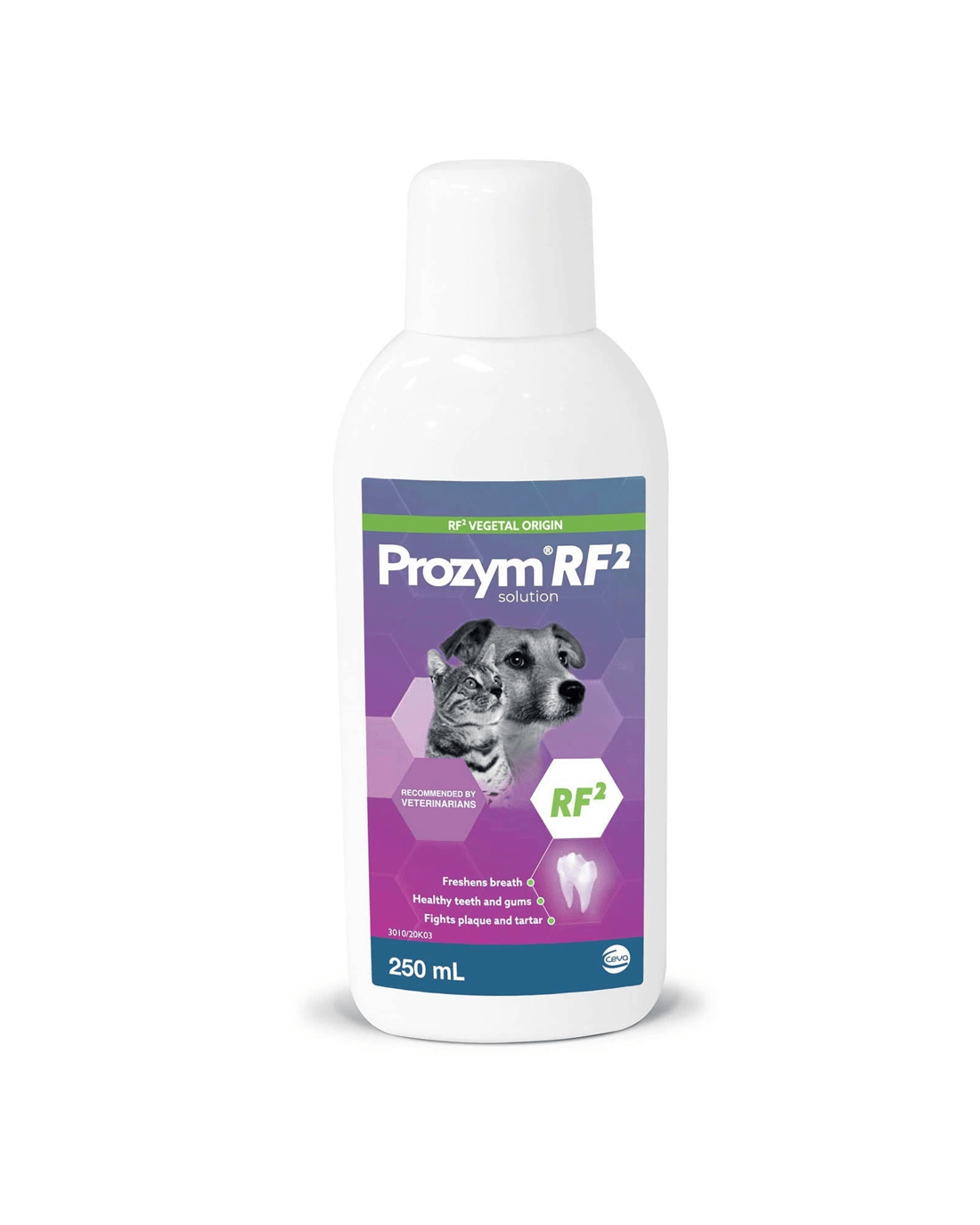 Prozym Solution now features a new look and enhanced formula with the exclusive active ingredient RF2, designed to eliminate biofilm caused by oral bacteria in dogs. Biofilm is the first stage of dental plaque, so treating it early helps prevent more serious dental issues and bad breath. Suitable for both dogs and cats.