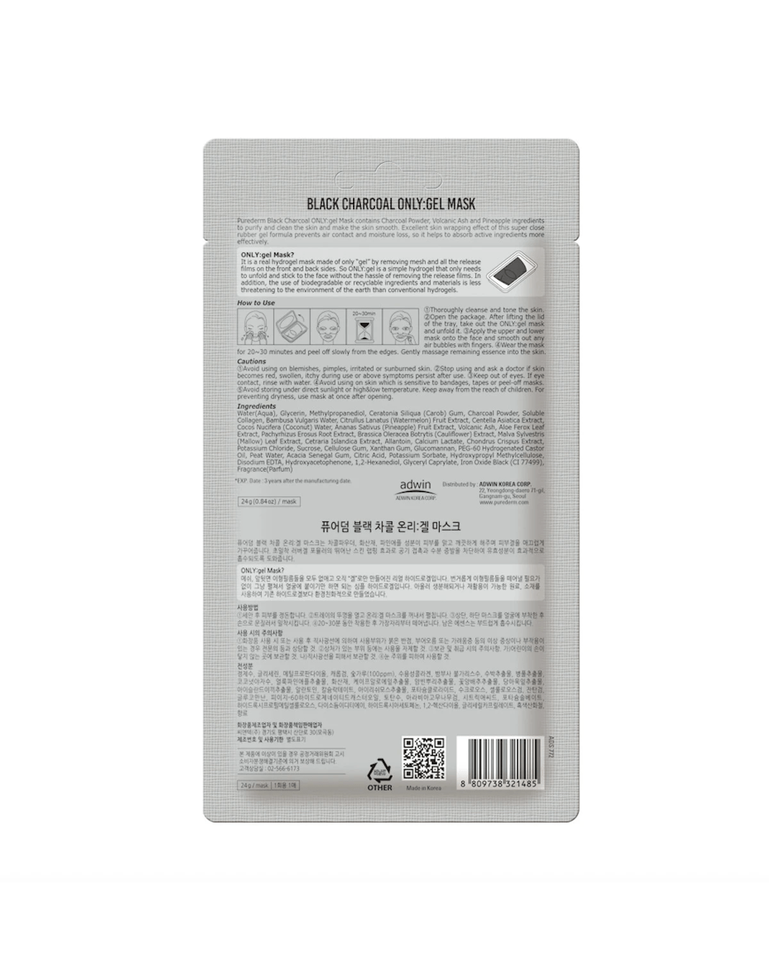 Purederm Black Charcoal ONLY: gel Mask contains charcoal powder, volcanic ash and pineapple ingredients to purify and clean the skin and make the skin smooth. Excellent skin wrapping effect of this super close rubber gel formula prevents air contact and moisture loss, so it helps to absorb active ingredients more effectively.