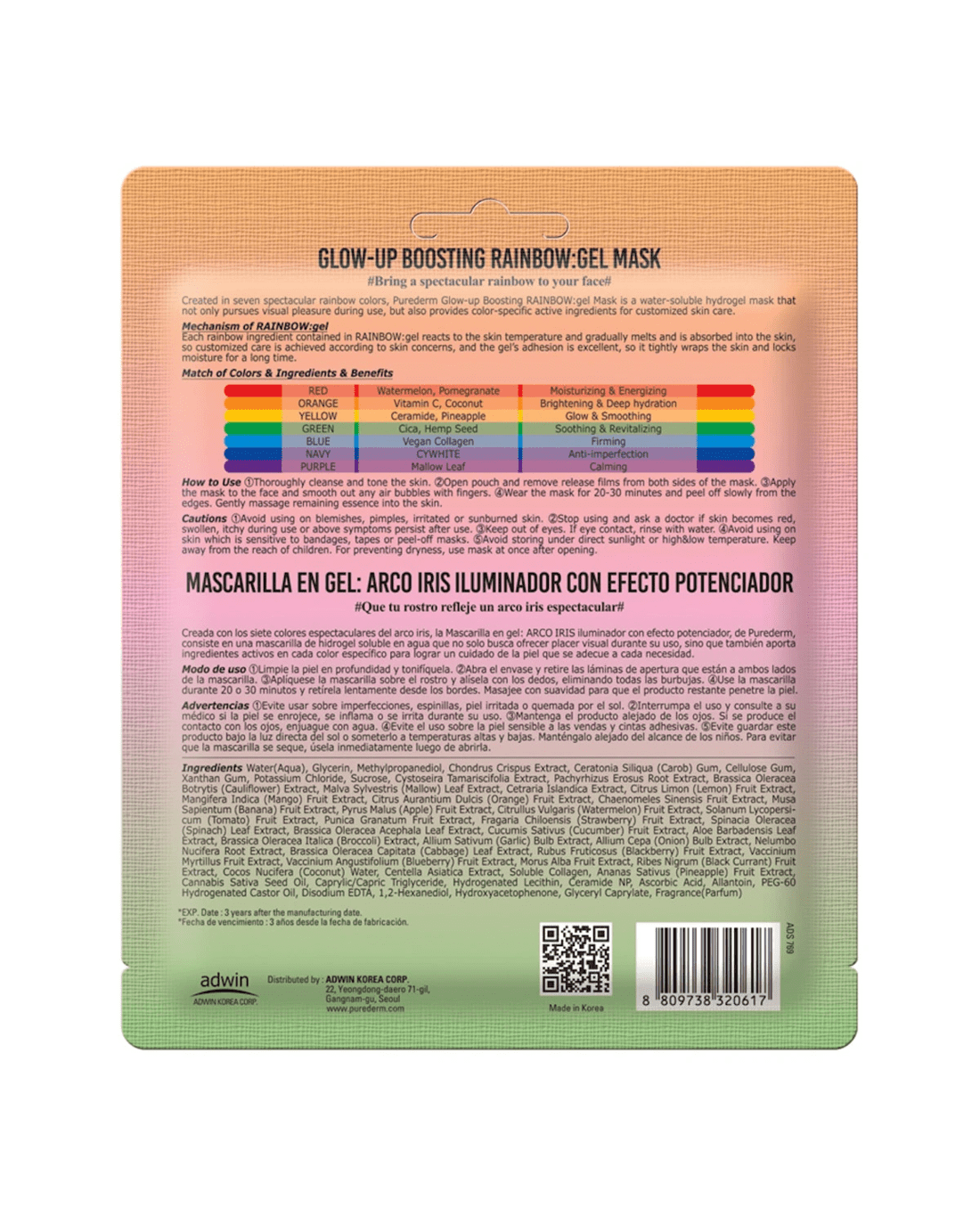 Each rainbow ingredient contained in rainbow:Gel reacts to the skin temperature and gradually melts and is absorbed into the skin, so customised care is achieved according to skin concerns and the gel's adhesion is excellent, so it tightly wraps the skin and locks moisture for a long time. - Made in Korea