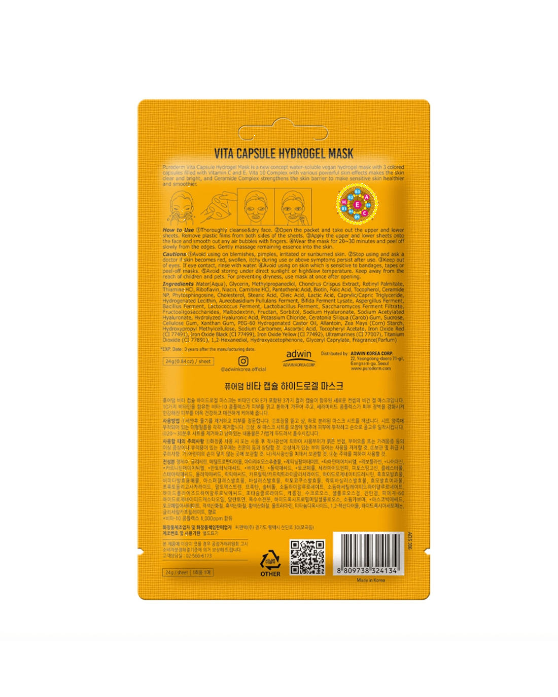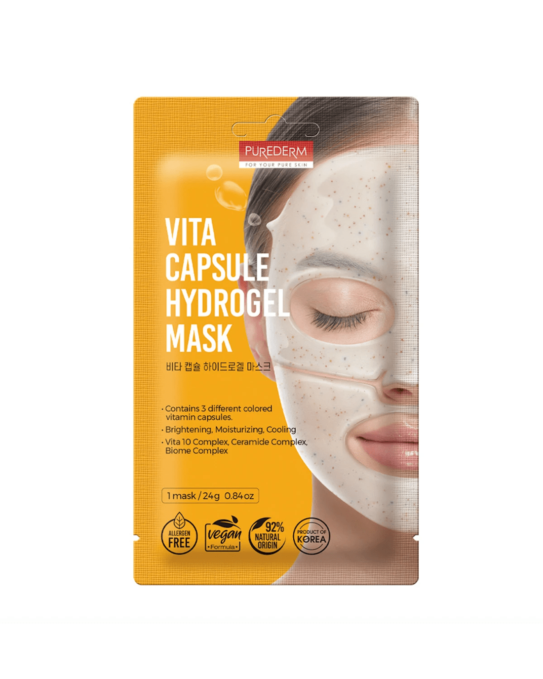 Purederm Vita Capsule Hydrogel Mask is a new concept water-soluble vegan hydrogel mask with 3 colored capsules filled with vitamin C and E. Vita 10 complex with various powerful skin effects makes the skin clear and bright and ceramide complex strengthens the skin barrier to make sensitive skin healthier and smoother.