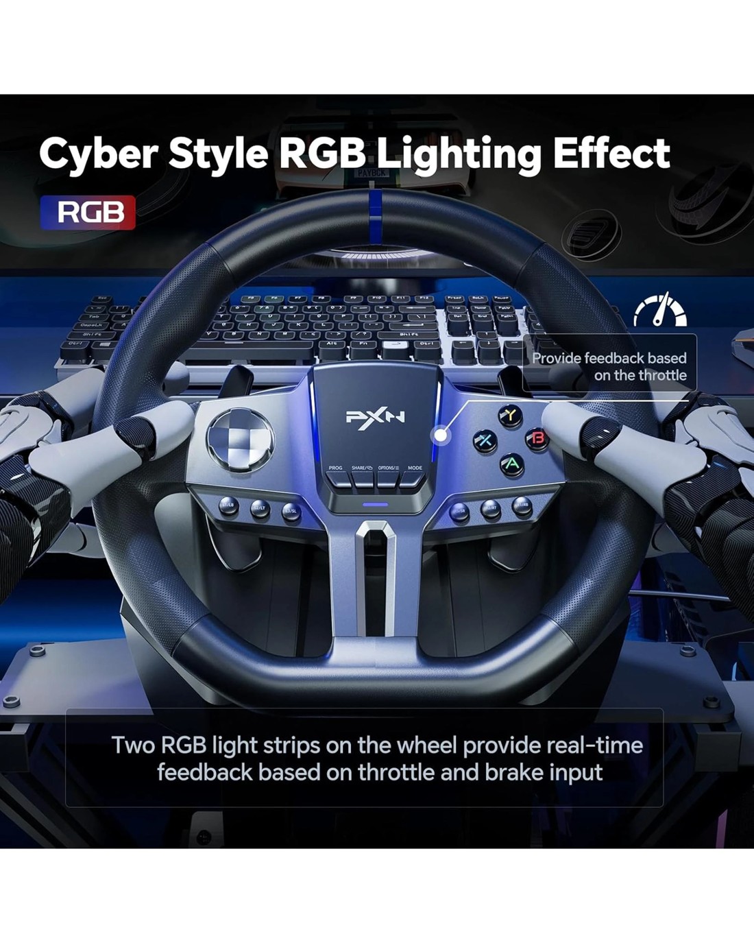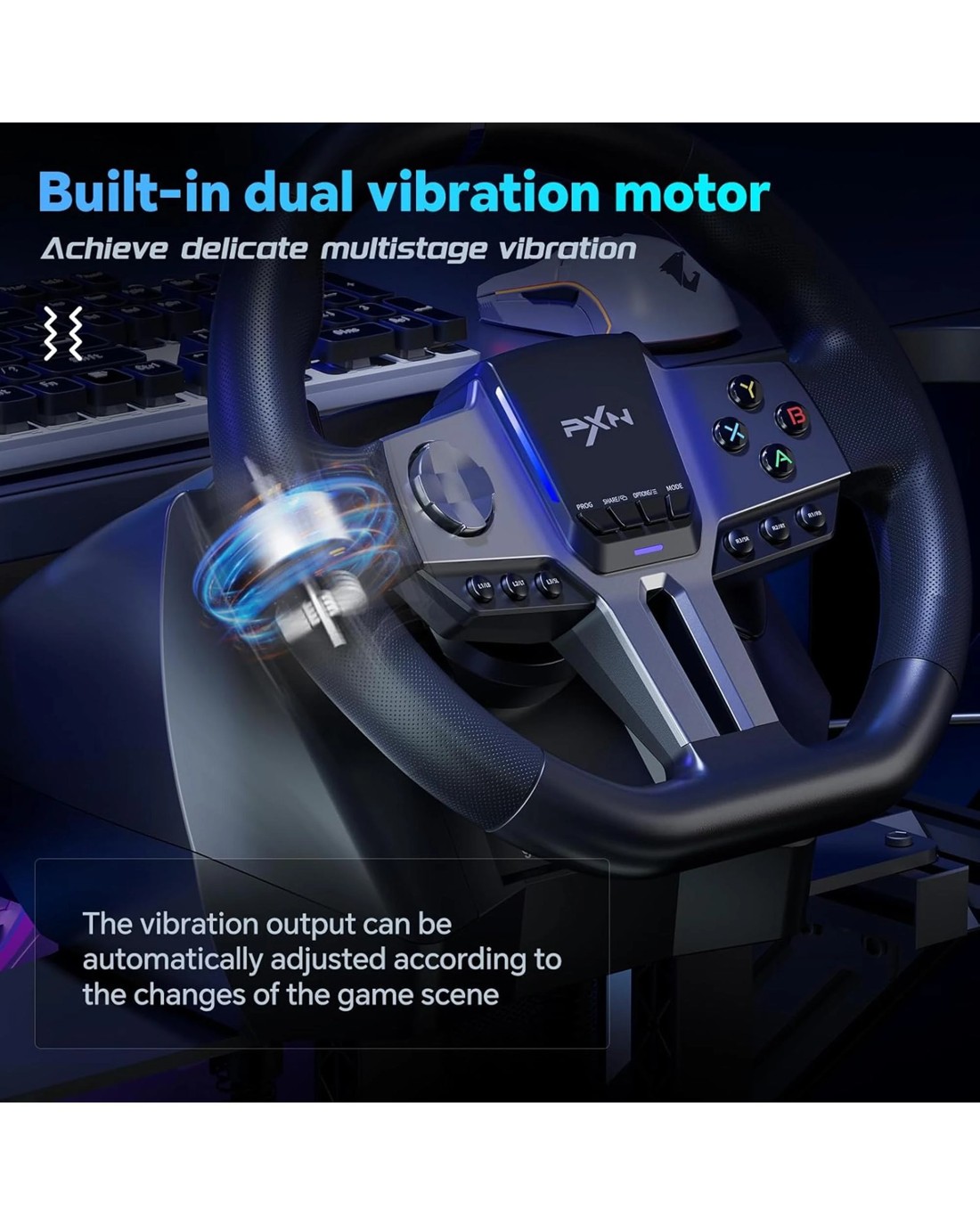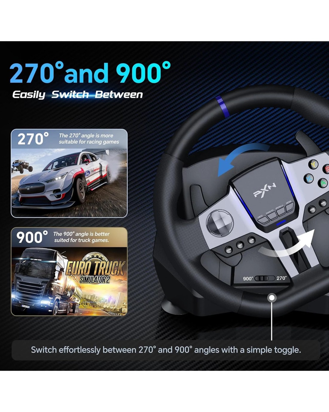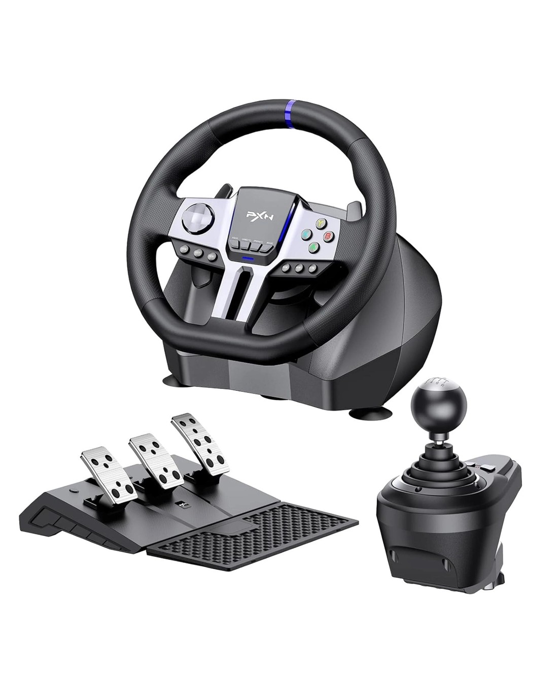 Multi-Platform Compatibility: PXN V9 GEN2 compatible for PC, PS3, PS4, Xbox One, Xbox Series X/S, and Switch. It features a dedicated app for adjustments, allowing personalized steering wheel settings. Players can download and install the "PXN Wheel" app from the Apple App Store or Google Play. (Note: The gear shifter is only compatible with simulation driving games and not with racing games.) Realistic Racing Wheel Design: Built-in dual vibration motors automatically adjust vibration output according to game scenarios, providing nuanced multi-level vibrations for a more immersive driving experience. The formula-style dual paddle shifters allow for easy gear changes with just a finger slide, making you feel like you're on the track, significantly enhancing the fun of control! High-Precision Base: The base uses a magnetic encoder with a resolution of 16 bits. Magnetic encoding technology captures the movement of the steering wheel in real time, ensuring precise control during rotation and other operations, thereby enhancing the gaming experience. High-Quality Gear Shifter: The 6+1 gear shifter simulates the shifting actions and feel of a real vehicle. It includes two customizable buttons for switching between high/low gear and a handbrake function. Equipped with a mounting clamp, the gear shifter can be securely fixed to tables up to 4.5 cm thick. Hall Effect Pedals: Utilizing Hall effect sensor technology, the pedals offer high precision and excellent linearity, accurately detecting foot pressure for a more responsive and accurate racing experience. The textured pedals and anti-slip design on the bottom ensure stable operation without shifting. The steering wheel features pedal indicator lights, and two RGB light strips on the wheel provide real-time feedback based on throttle and brake input. 270&900 Rotation: A physical button allows for easy and flexible switching between 270-degree and 900-degree rotation angles. The 900-degree setting is ideal for driving simulation games like Euro Truck Simulator and American Truck Simulator. The 270-degree setting is perfect for racing games such as Need for Speed, Forza Horizon 4, and GTA 5.