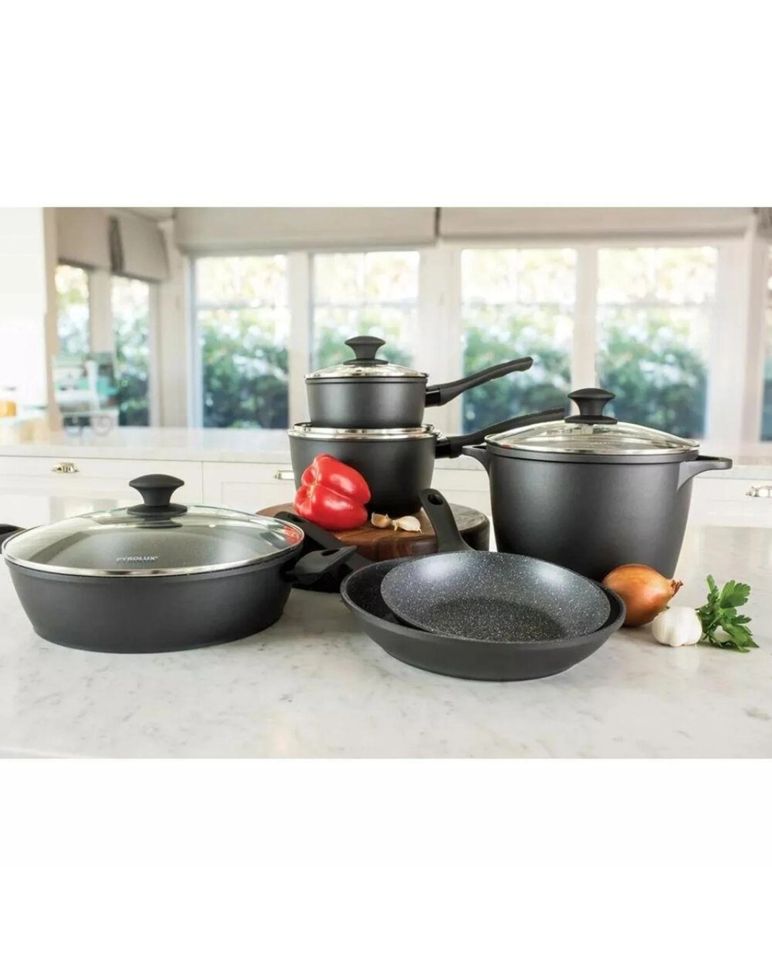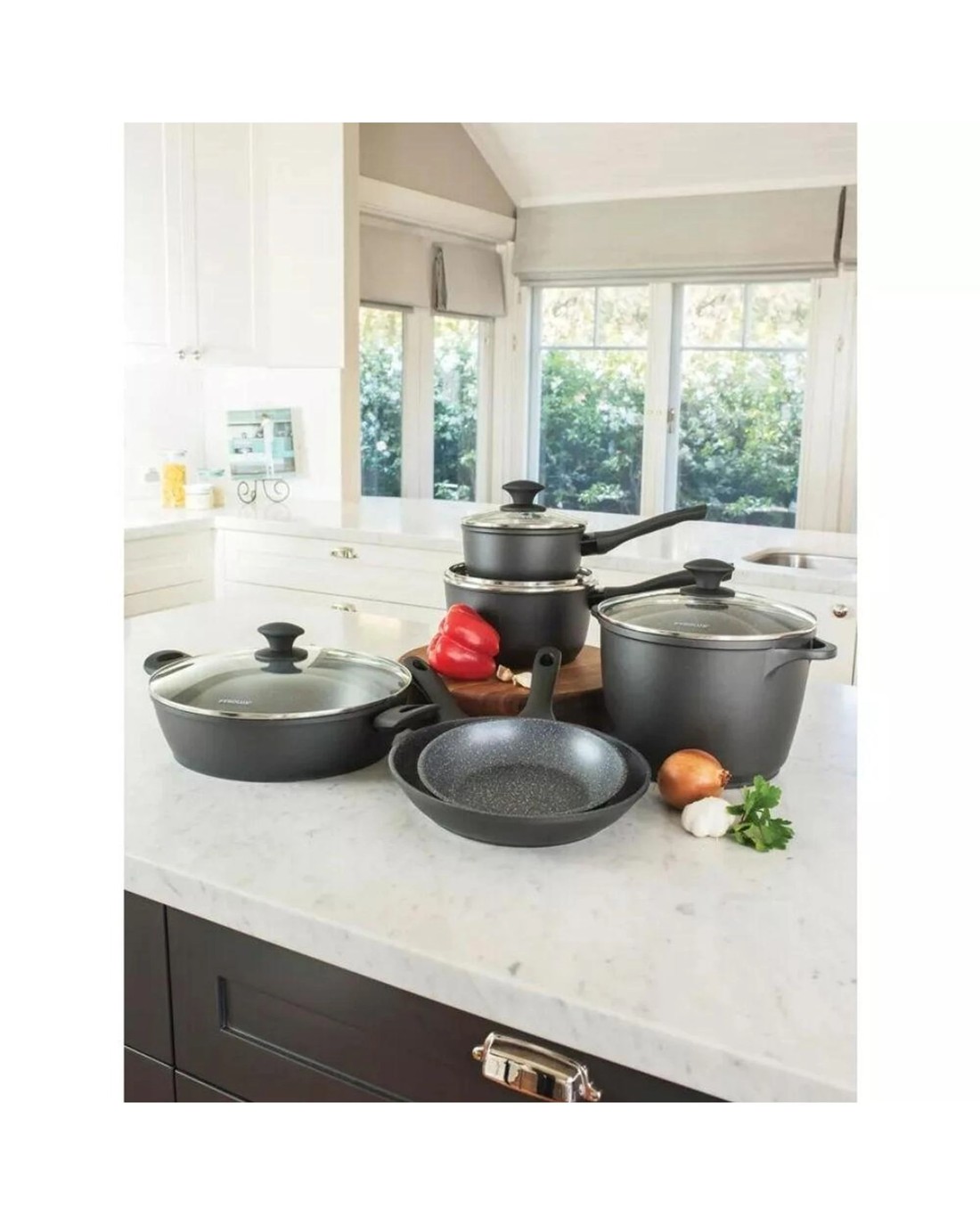 • Soft touch ergonomic handles stay cool longer on the cooktop