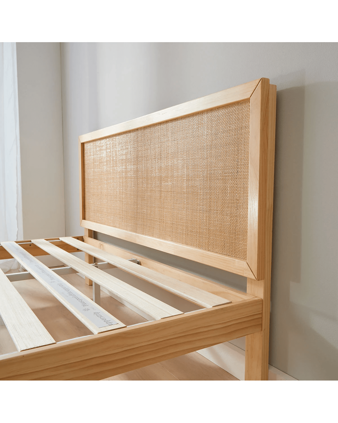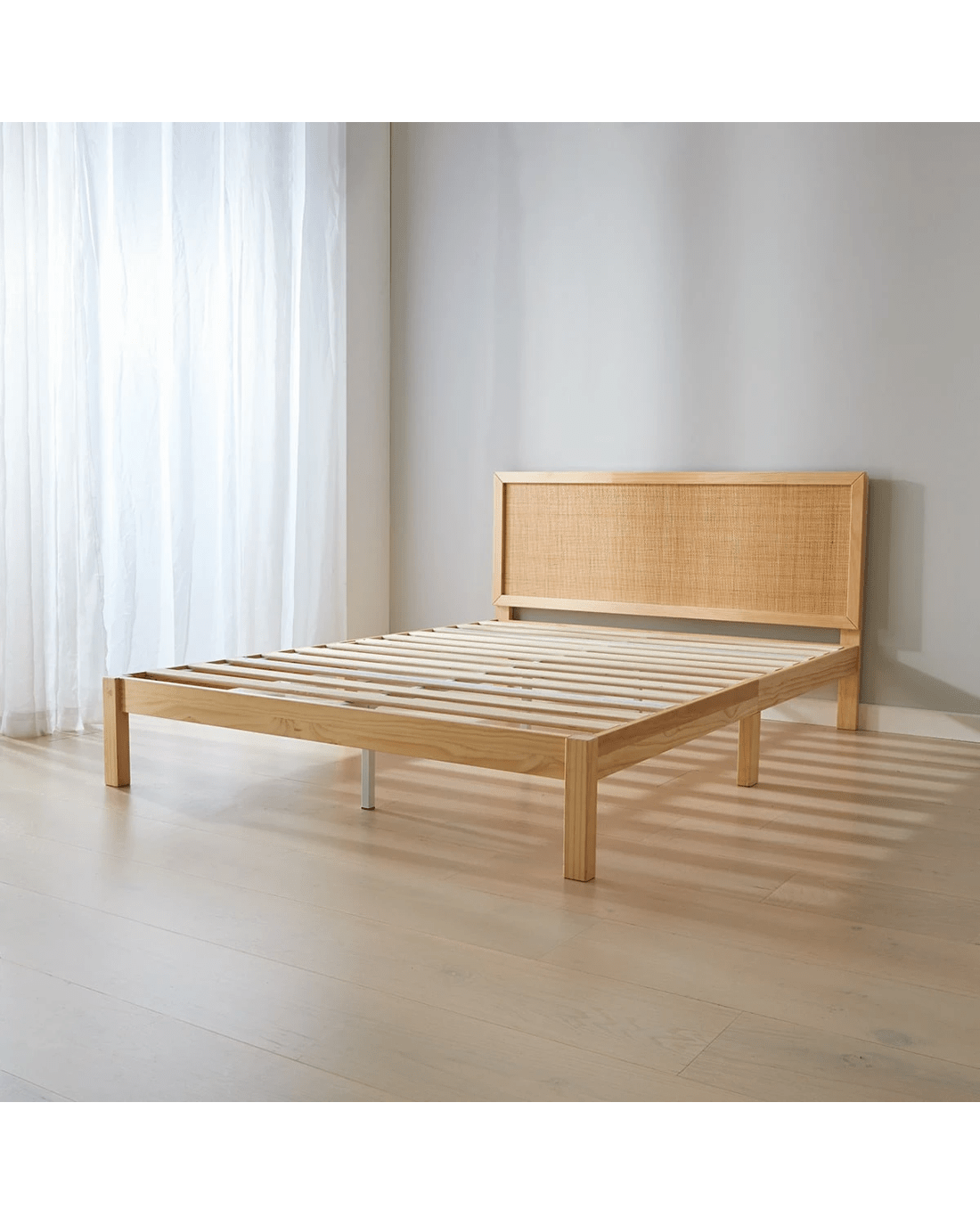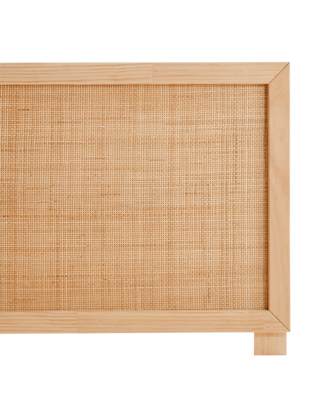 Add style to your bedroom with this on trend Rattan bed! The headboard is finished with natural rattan for a contemporary look that can be paired with most bedsides or bedroom furniture. The base is made from natural pine and has a steel centre rail and support feet for added strength.