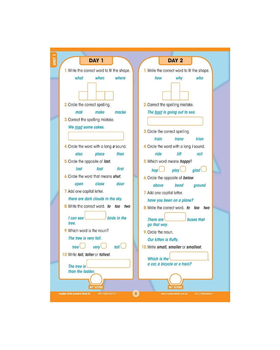 - Spelling, phonic analysis, word knowledge, and punctuation and grammar questions are included for each day.