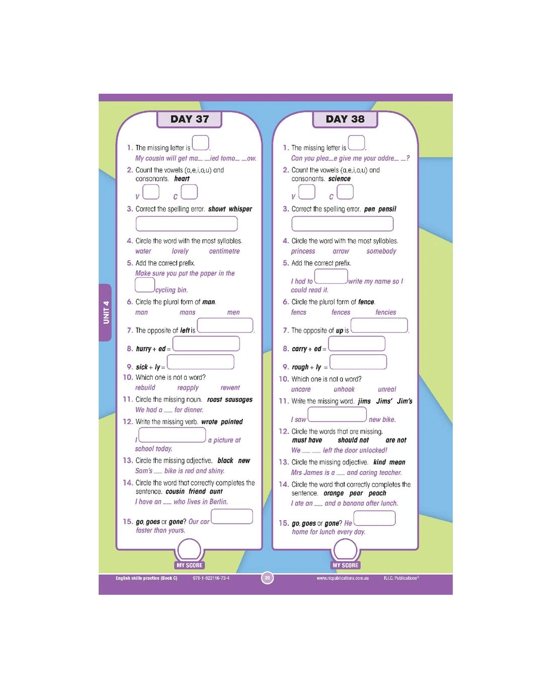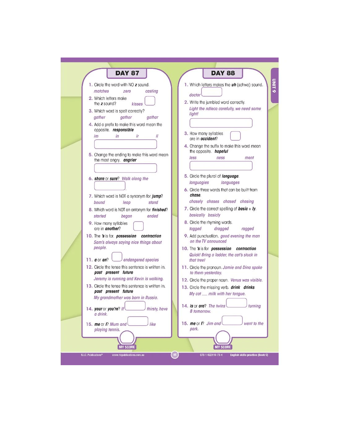 - Spelling, phonic analysis, word knowledge, and punctuation and grammar questions are included for each day.