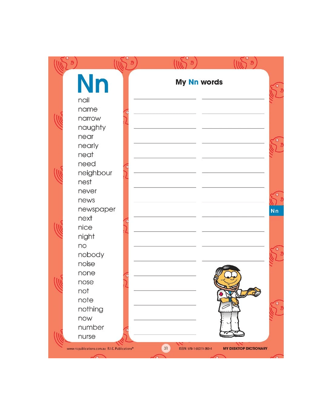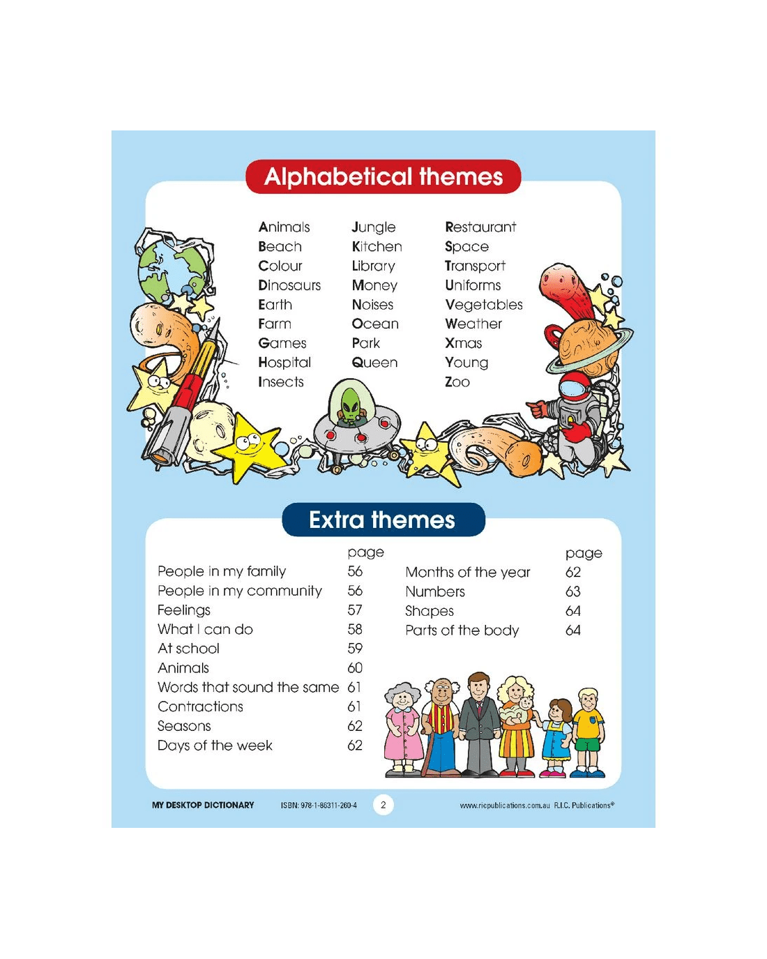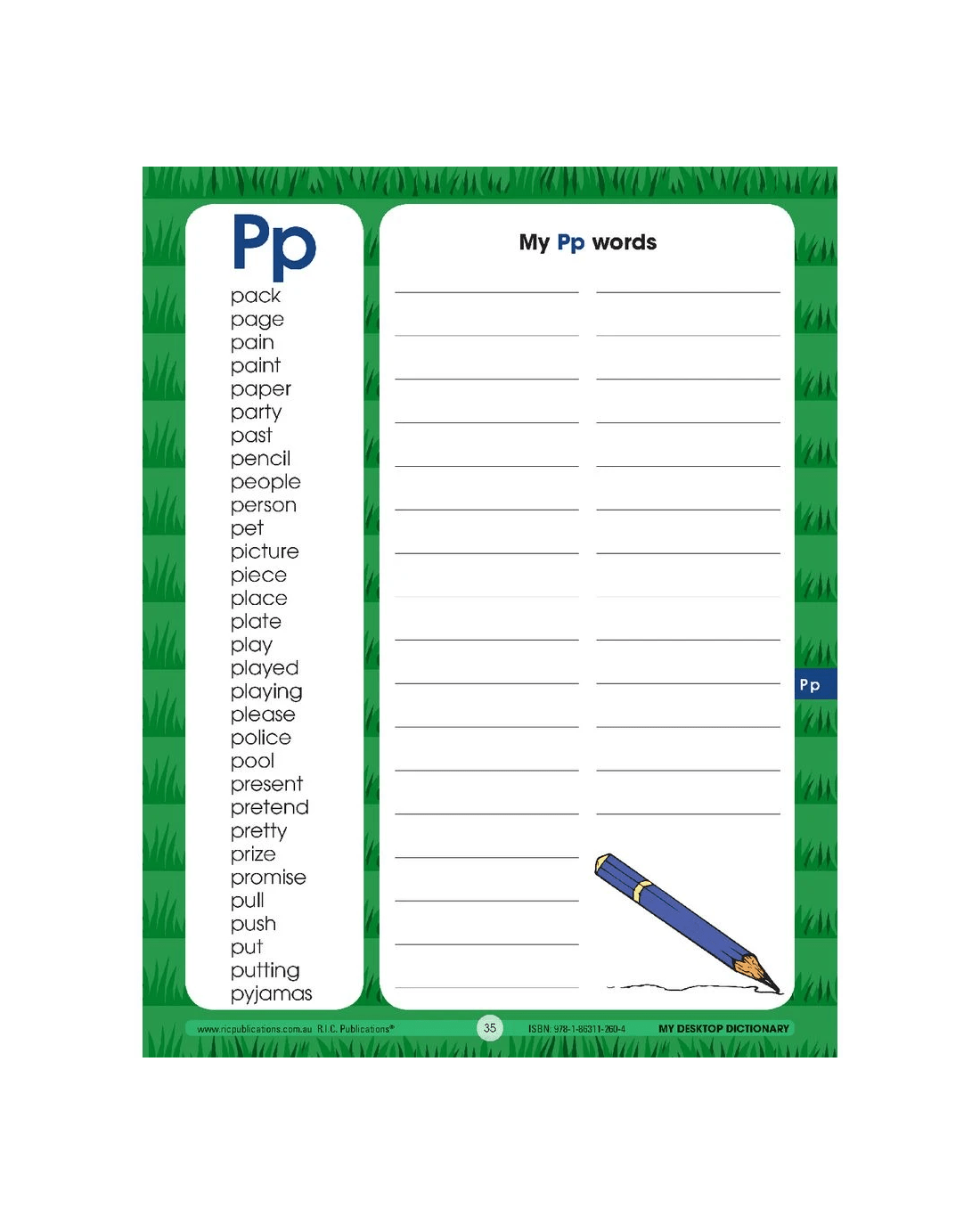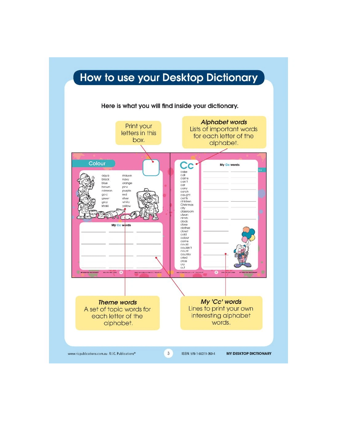 The R.I.C My Desktop Dictionary is designed, written and illustrated for young learners between 5 and 8 in age. It includes a variety of commonly used words for them to learn, plus spaces to record new words so they can continue their learning. There's a blank space on each corner of every double page so students can write out the alphabet.