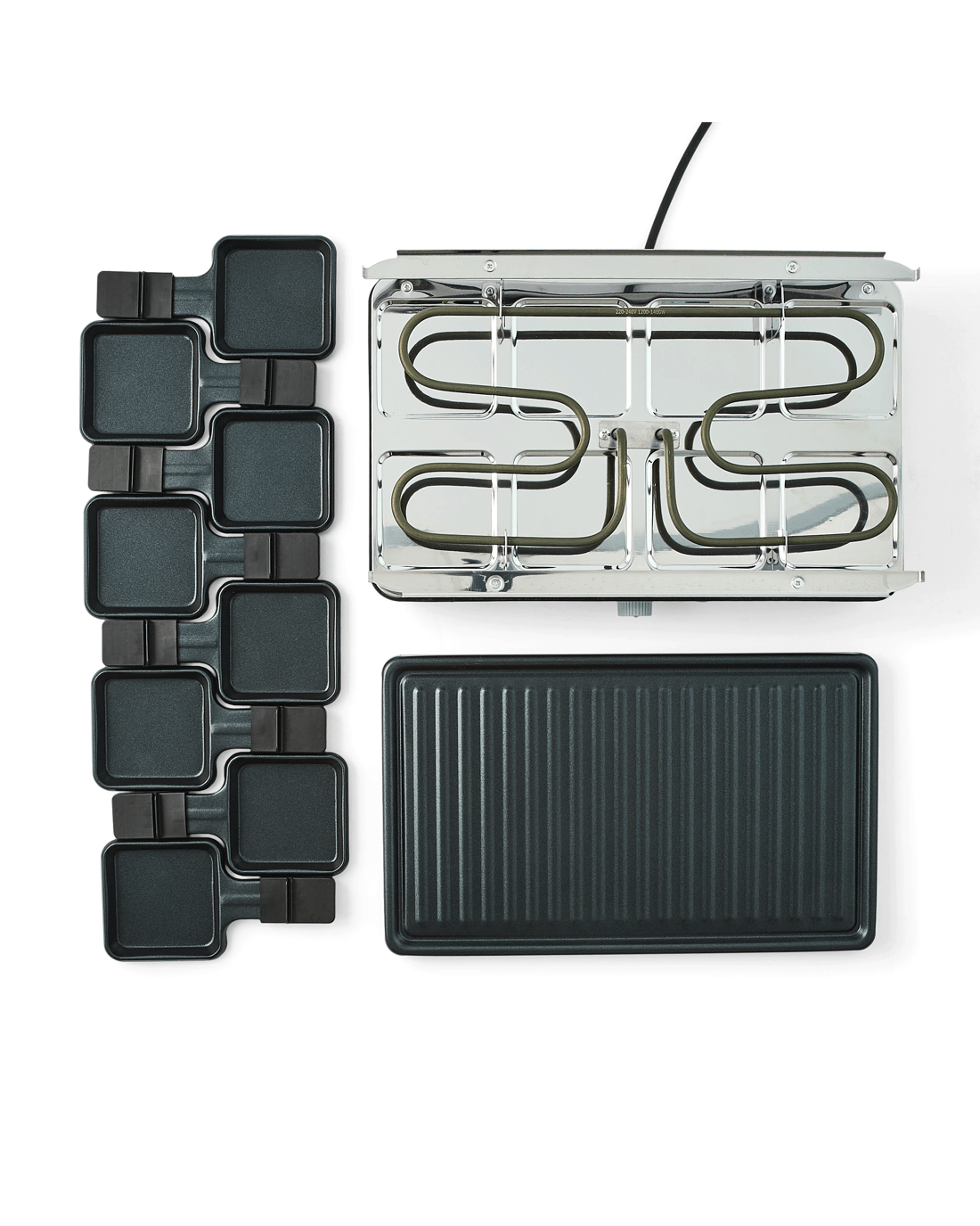 - Includes 1 x grill and 8 x raclette pans