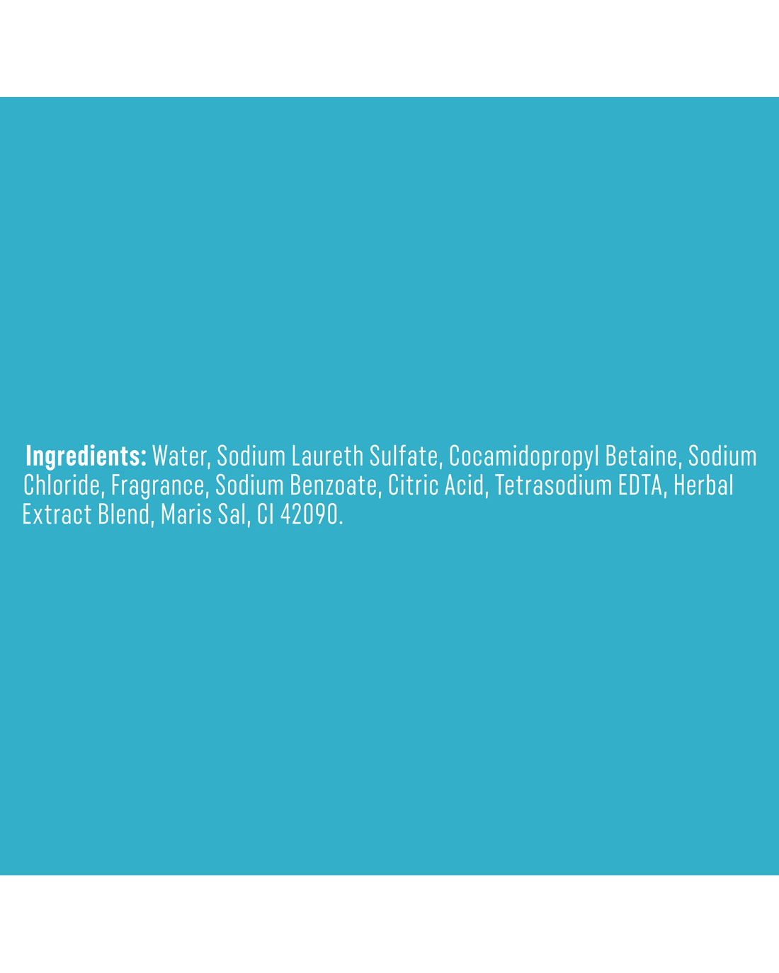 • Ingredients: Water, Sodium Laureth Sulfate, Cocamidopropyl Betaine, Sodium Chloride, Fragrance, Sodium Benzoate, Citric Acid, Tetrasodium EDTA, Herbal Extract Blend, Maris Sal, CI 42090
