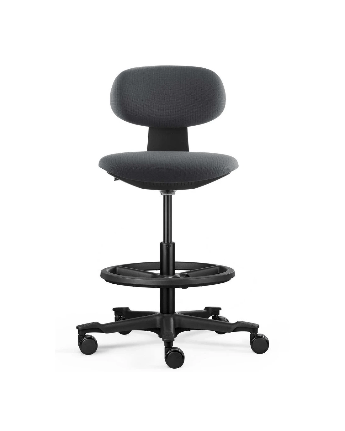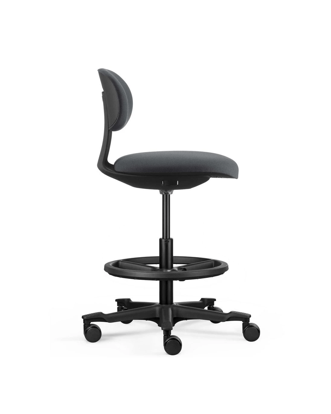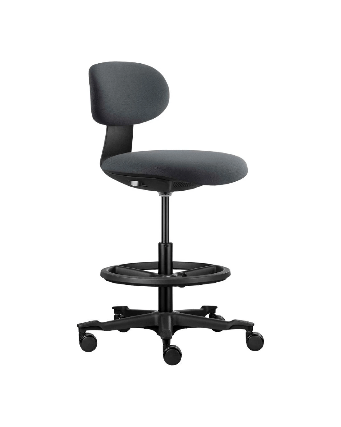 - The backrest and seat are covered in a dark grey fabric while the frame and nylon stool base are black.